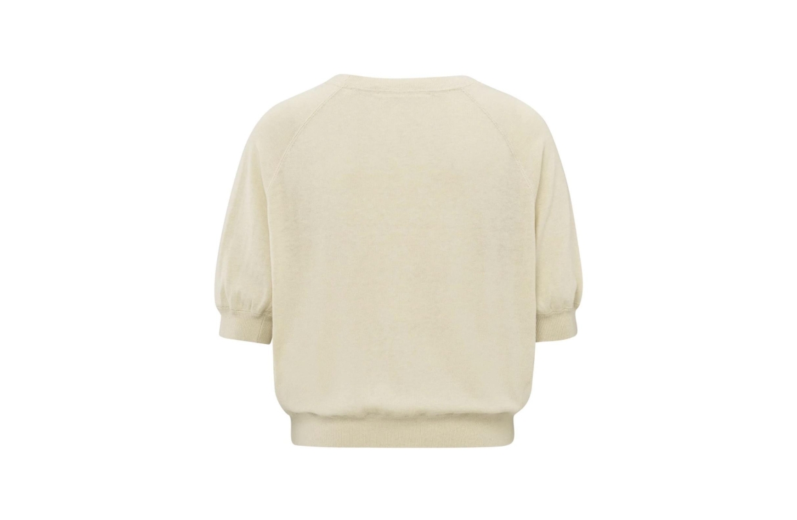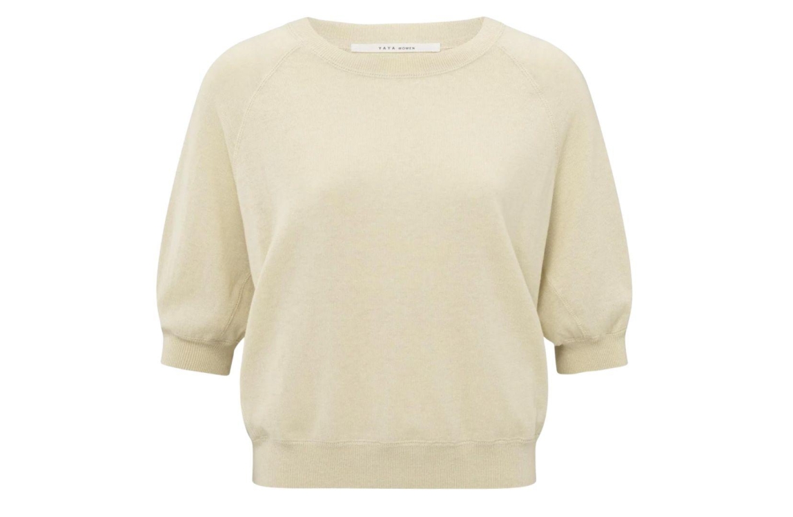Yaya online sweater 01-000460-504. Dit soepelvallende model is voorzien van een ronde hals en driekwart mouwen. Deze beige sweater van Yaya is uitgevoerd in een fijngebreide stof en is afgewerkt met ribboorden.