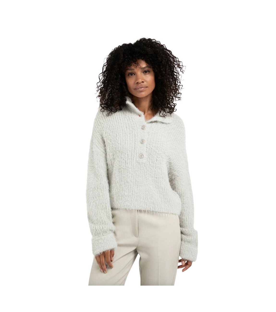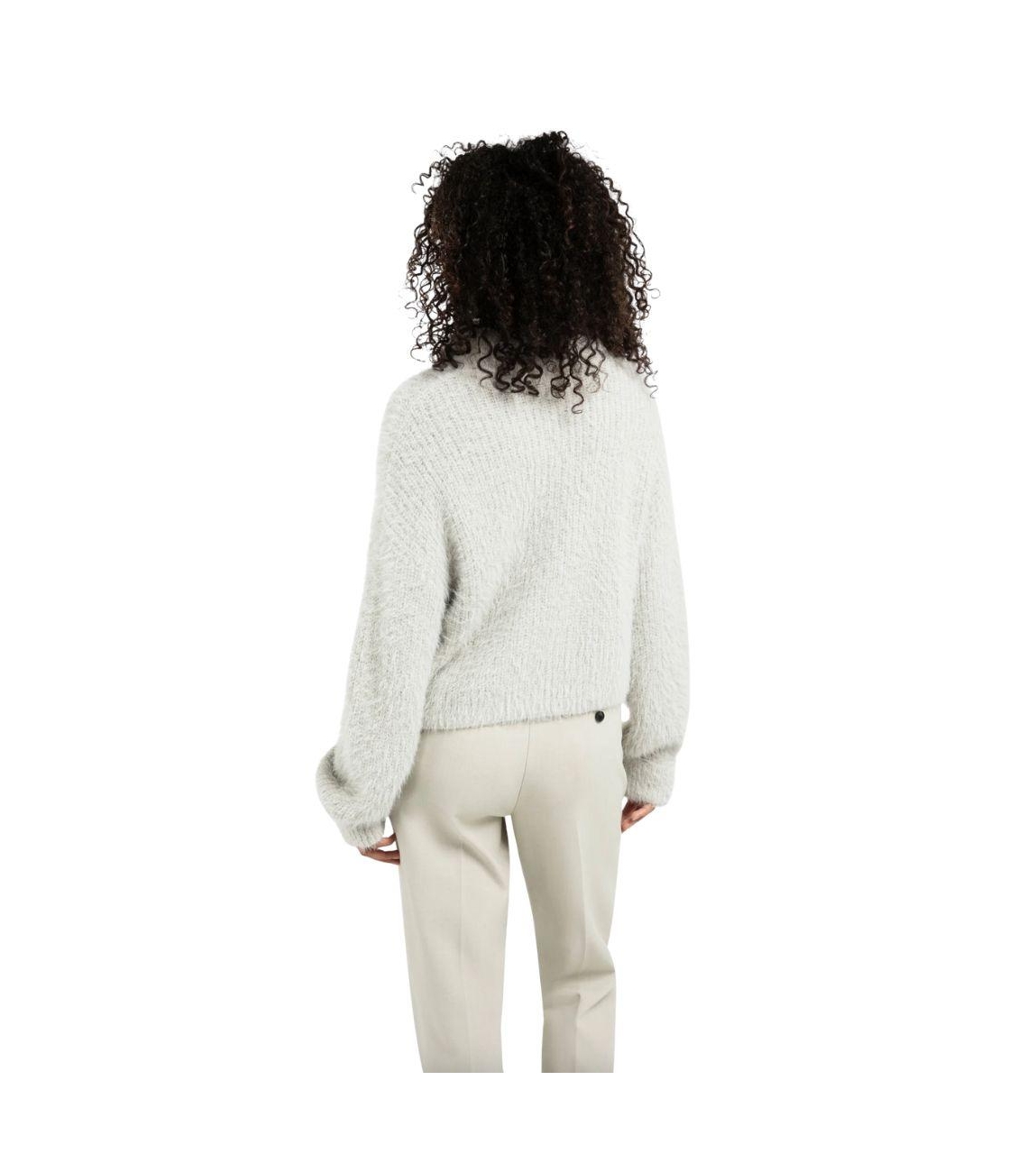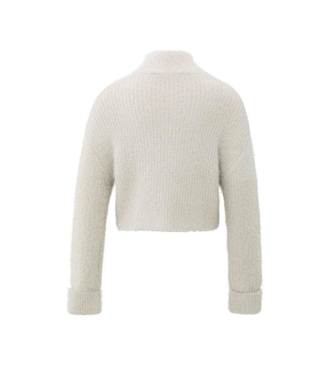 Yaya sweater 01-000527-511. Dit cropped model is voorzien van en col dat sluit door middel van knopen en heeft lange mouwen. Deze grijze sweater van Yaya is fluffy uitgevoerd.