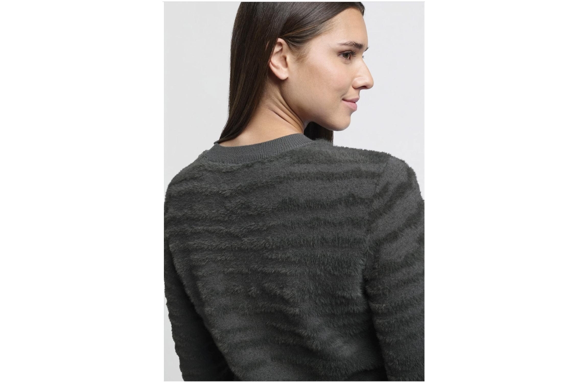 Yaya trui 01-000421. Dit rechtvallende model is voorzien van een ronde hals en heeft lange mouwen. Deze donkergrijze trui van Yaya is bewerkt met een all over zebramotief. Dit harige/teddy model is afgewerkt met ribgebreide boorden.