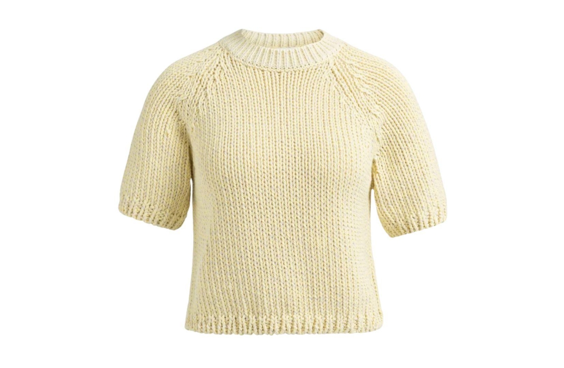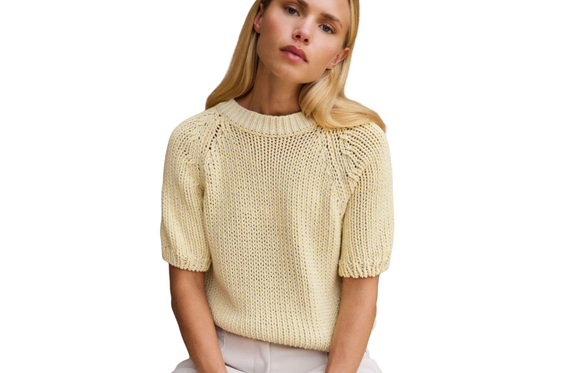 Yaya trui 01-000551-602 309151. Dit rechtvallende model heeft een ronde halslijn en korte mouwen. Deze geelkleurige trui van Yaya is uitgevoerd in grofgebreide kwaliteit en is afgewerkt met ribgebreide boorden.