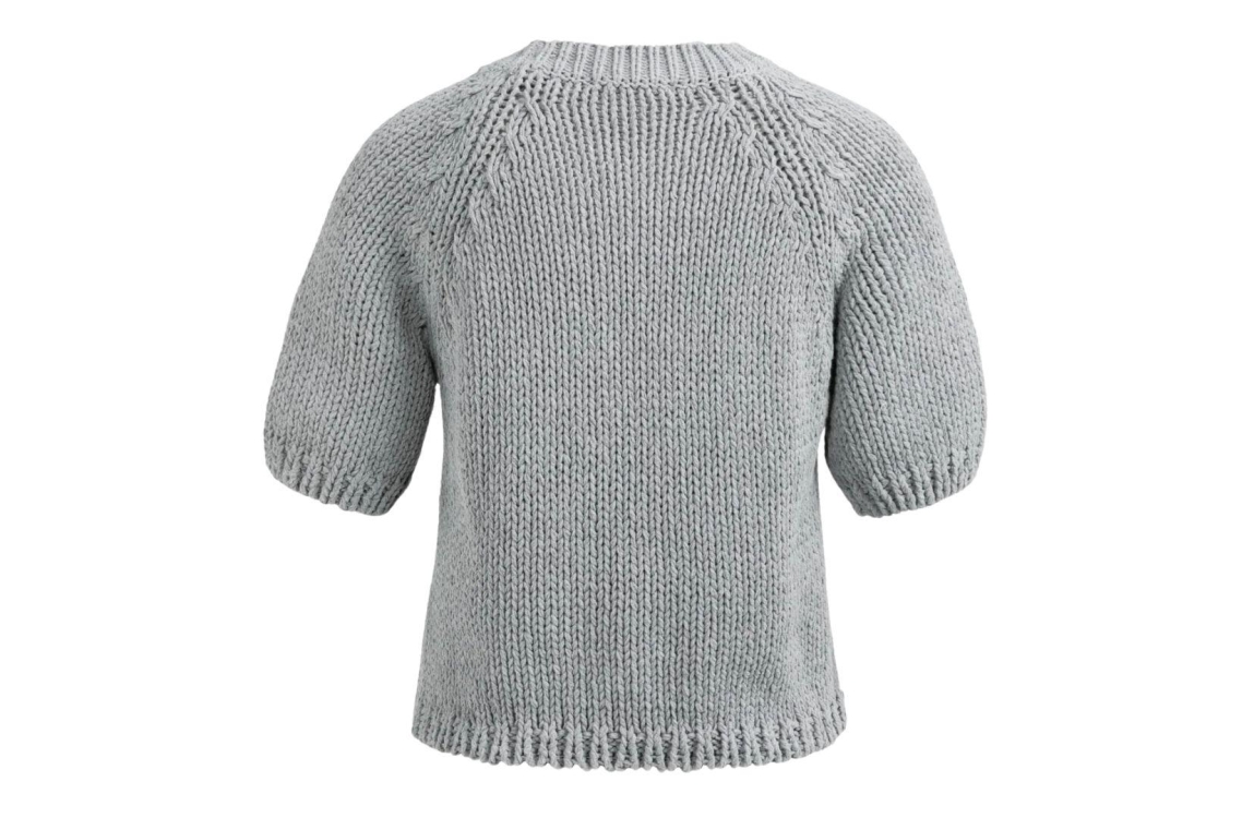 Yaya trui 01-000551-602 99047. Dit rechtvallende model heeft een ronde halslijn en korte mouwen. Deze grijze trui van Yaya is uitgevoerd in grofgebreide kwaliteit en is afgewerkt met ribgebreide boorden.