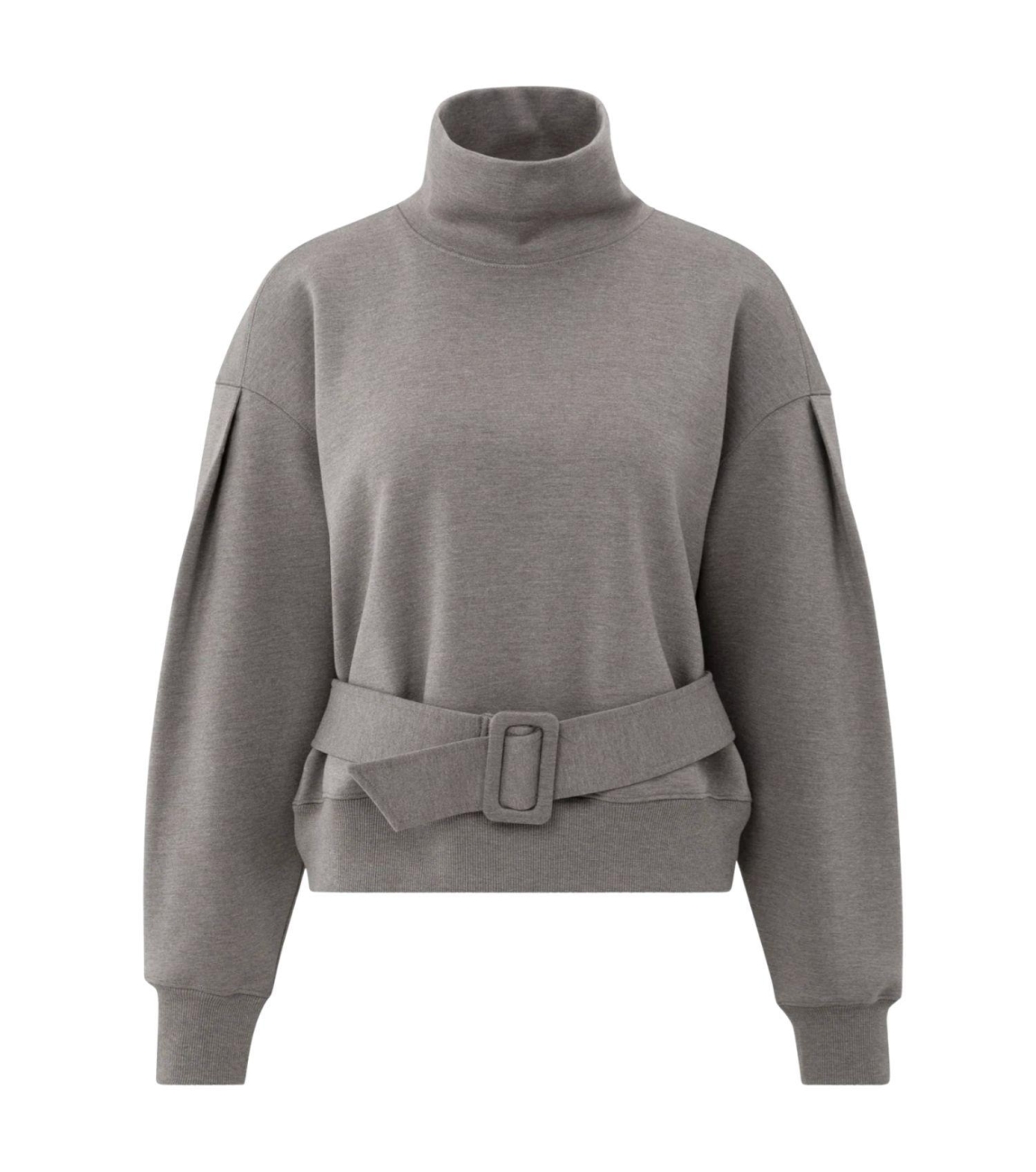 Yaya sweatshirt 01-109100-510. Dit rechtvallende model heeft een col en lange mouwen. Deze donkergrijze sweatshirt van Yaya is op de taille bewerkt met ceintuurdetail en heeft afgewerkte boorden.