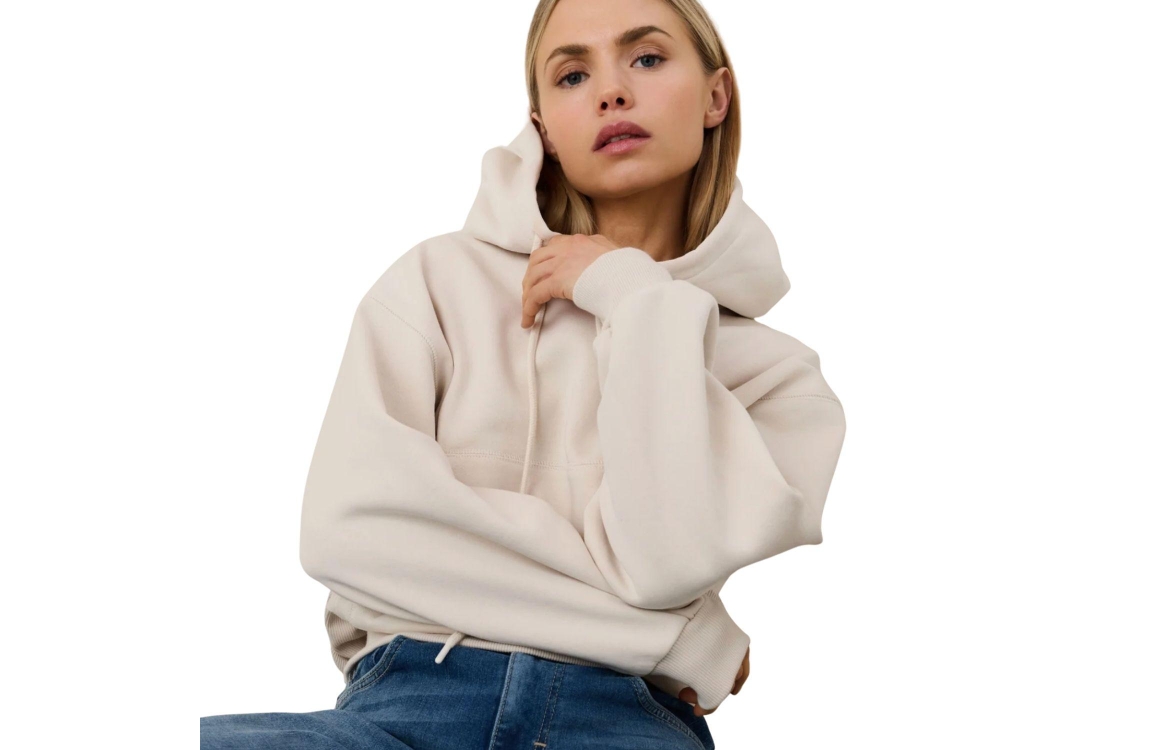 Yaya sweater 01-109095-509. Dit wijdvallende model heeft een capuchon met trekkoord en lange mouwen. Deze beige sweater van Yaya is op het voorpand gedetailleerd met een klassieke buidelzak en heeft ribgebreide boorden.