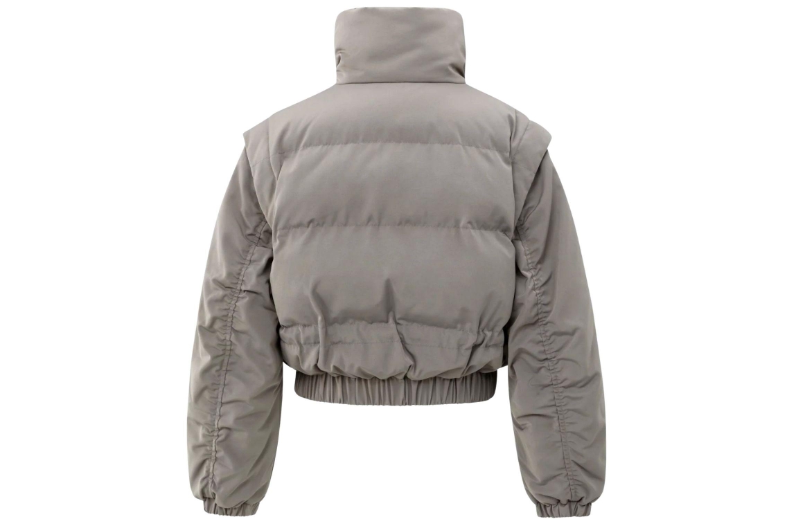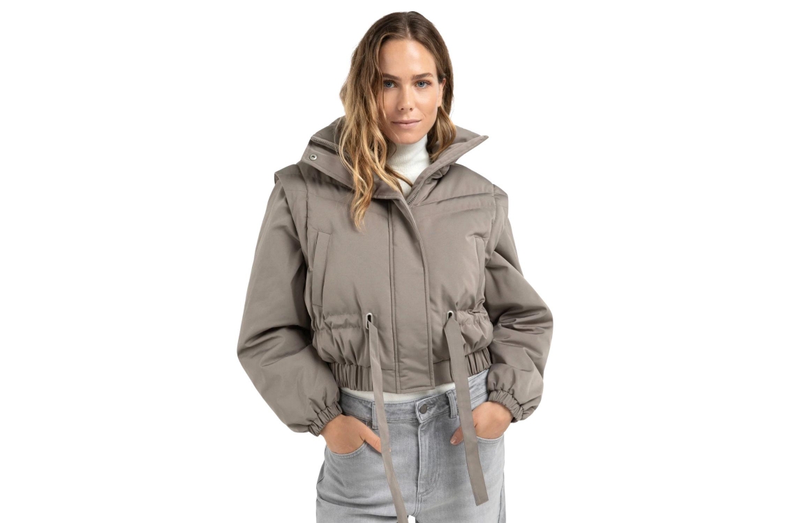 Yaya jas 02-001065-510. Dit oversized model heeft een hoge kraag en lange mouwen. Deze grijze/taupe jas van Yaya sluit aan de voorzijde door middel van knopen met ritssluiting en is voorzien van twee steekzakken. Het model heeft elastische boorden, is gewatteerd en is afgewerkt met een verstelbare trekkoord. Deze jas is ook te dragen als bodywarmer, dankzij de afritsbare mouwen.