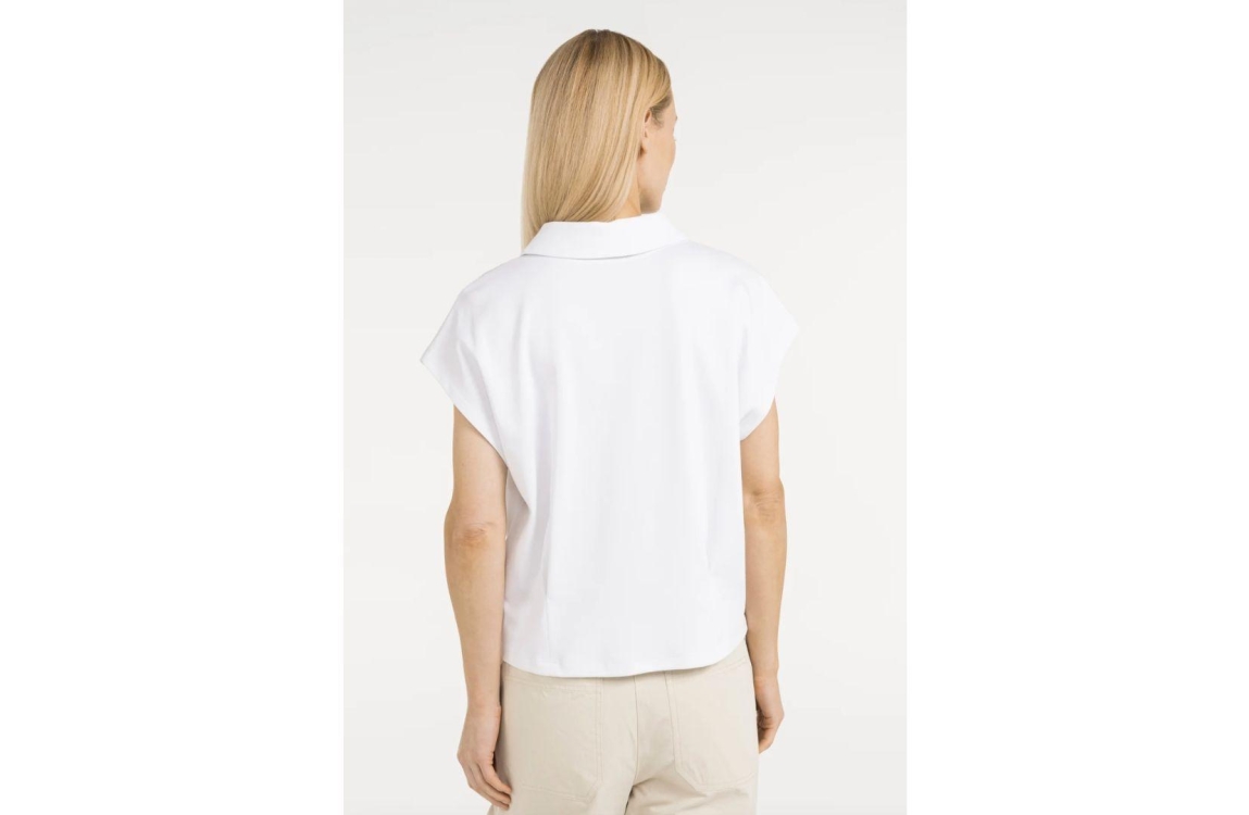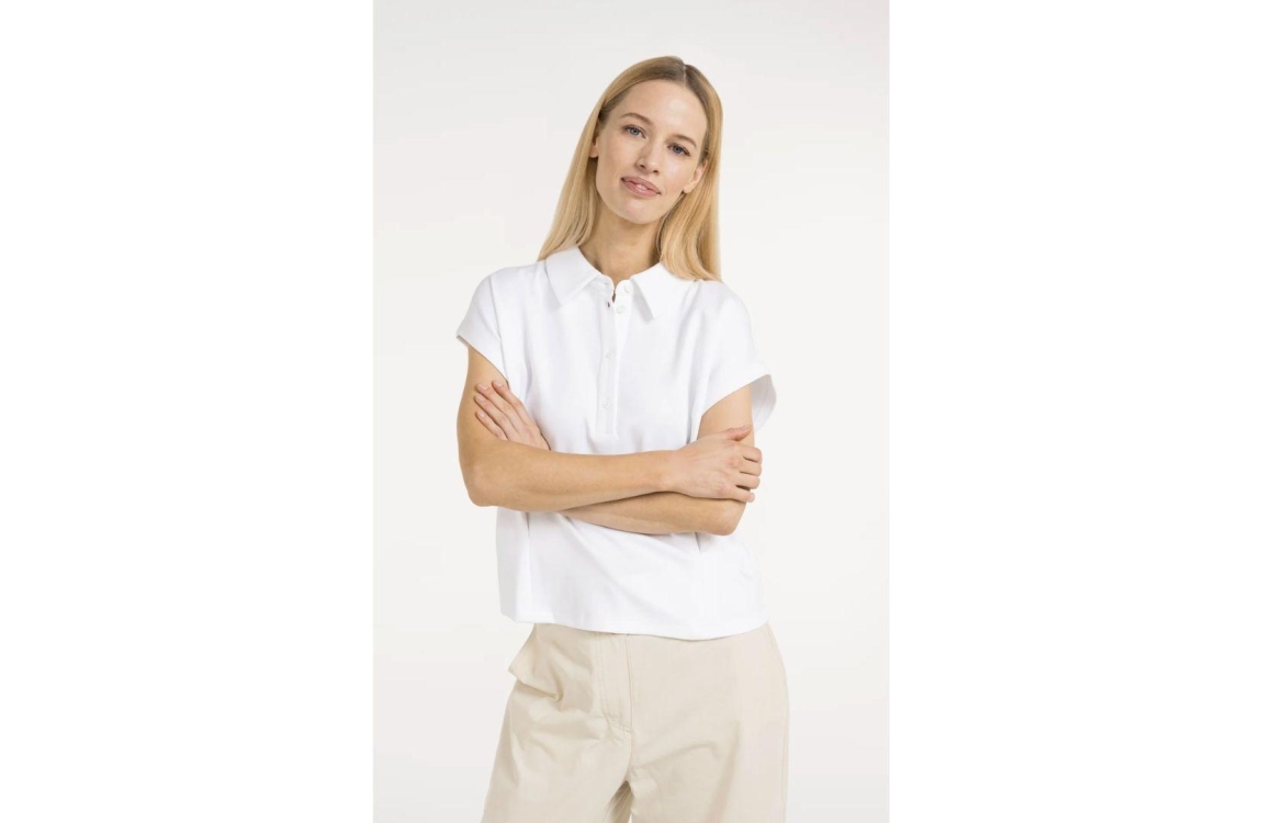 Yaya jersey blouse 01-209213-604. Dit rechtvallend model is voorzien van een polokraag en heeft korte kapmouwen. Deze witte blouse van Yaya sluit aan de bovenzijde door middel van knopen.