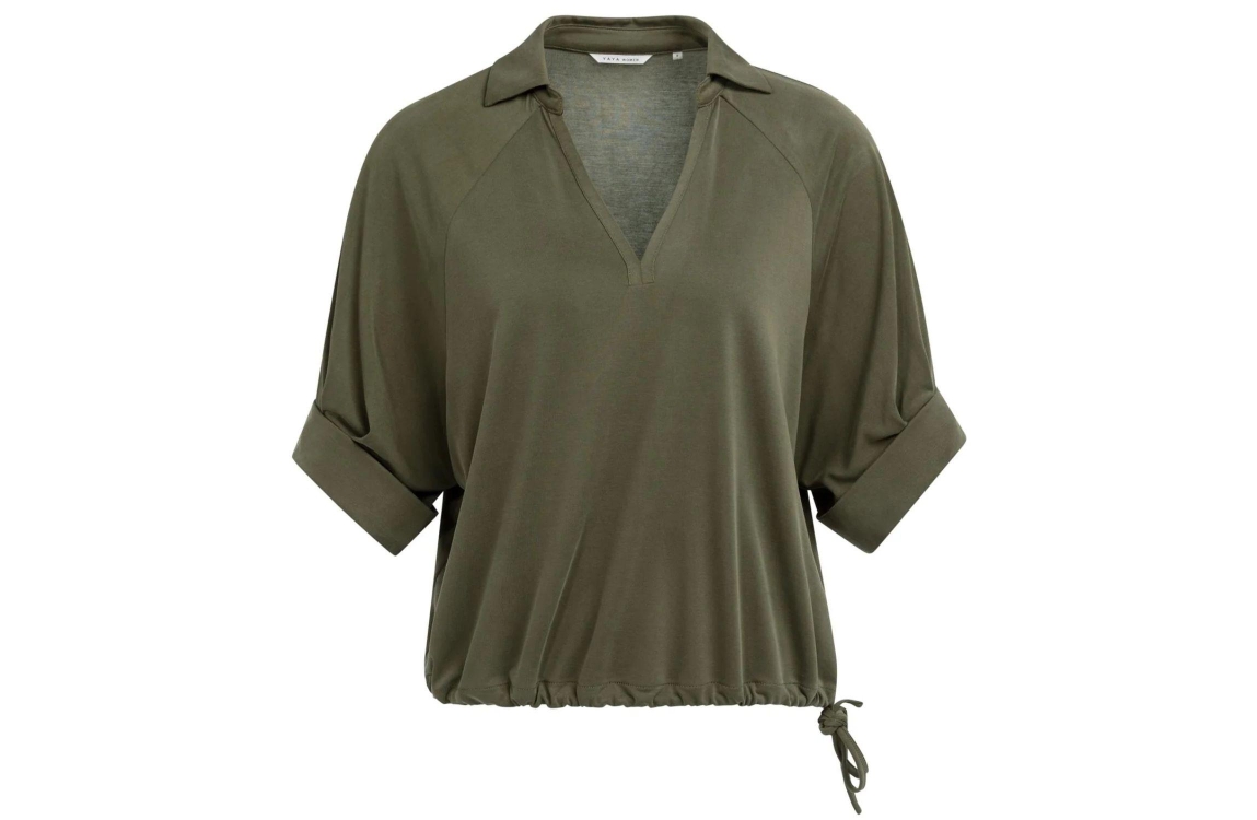 Yaya Jersey top with pleated sleeve 99065 Army green. Dit soepelvallende model is voorzien van een V-hals en heeft korte mouwen met subtiele plooidetails. Deze groene top van Yaya is afgewerkt met een koorddetail in de zoom.
