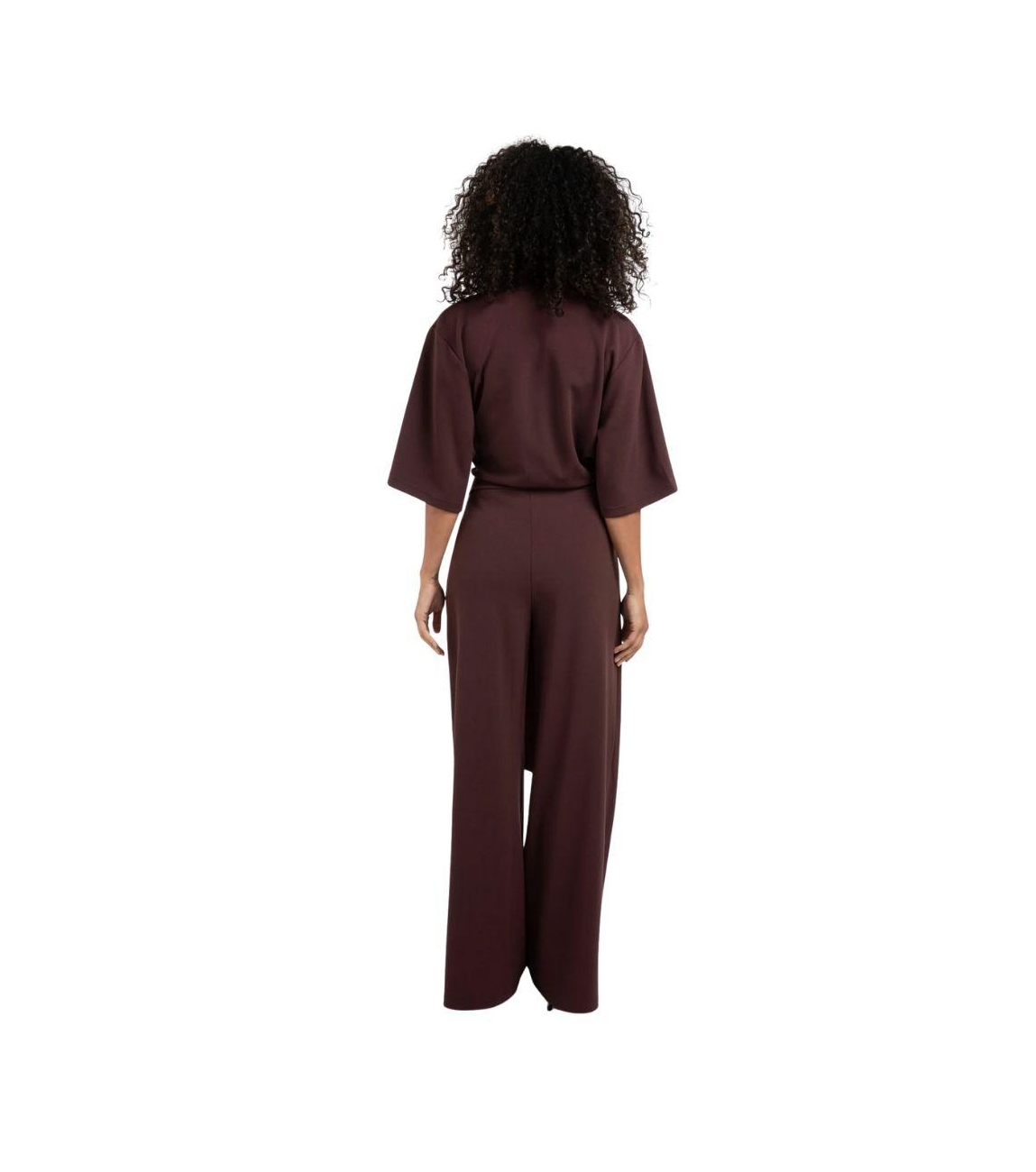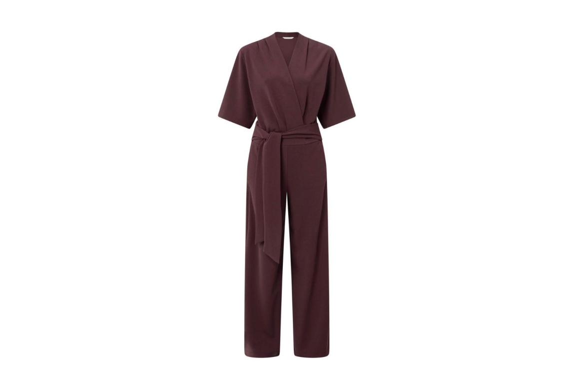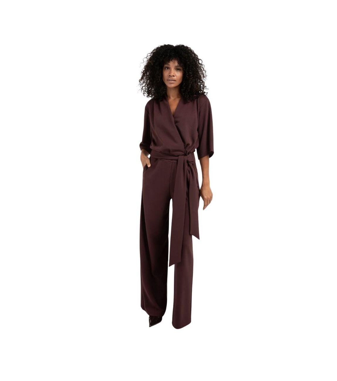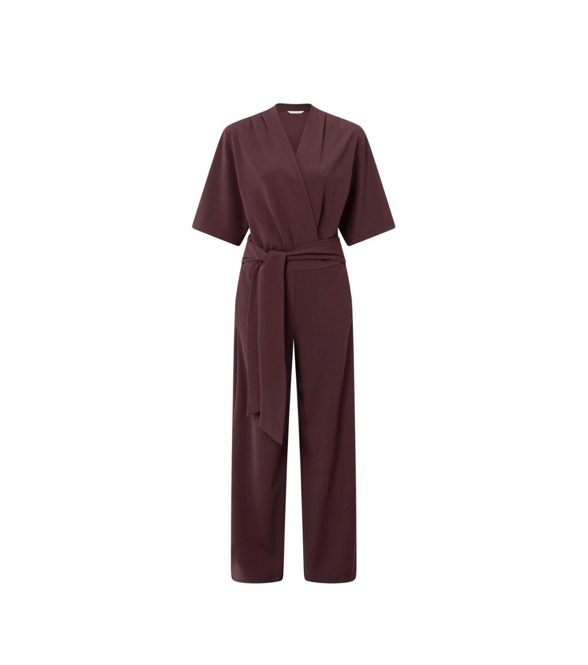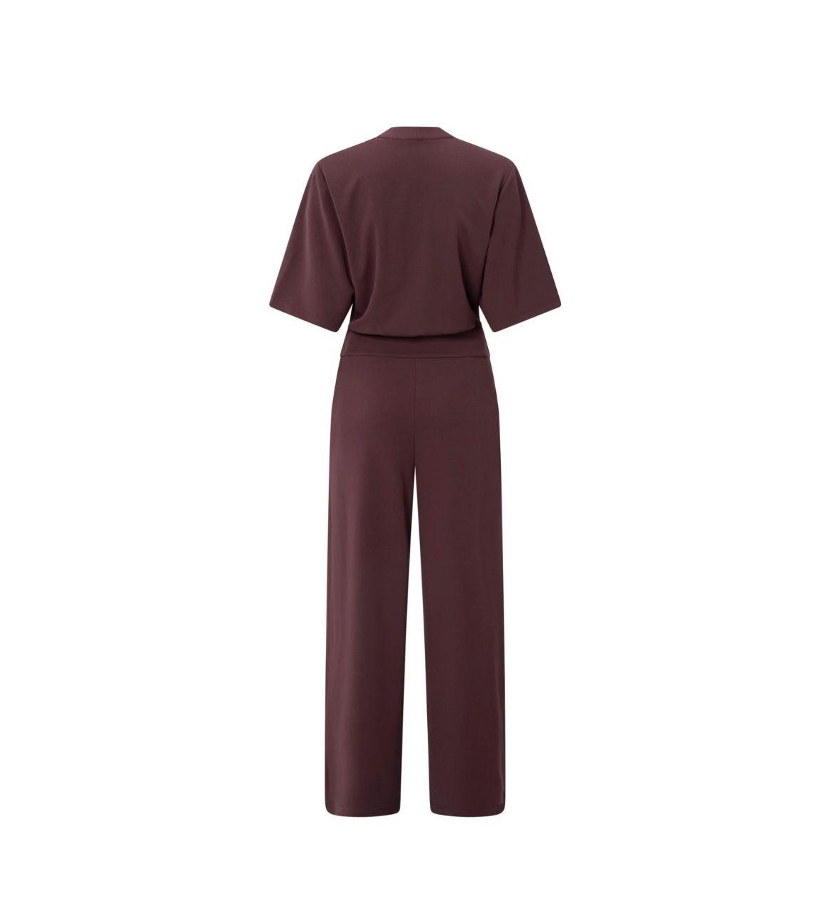 Yaya jumpsuit 01-349023-511. Dit rechtvallend model is voorzien van een v-hals en heeft korte mouwen. Deze bordeauxrode jumpsuit van Yaya sluit door middel van een strik ceintuur.