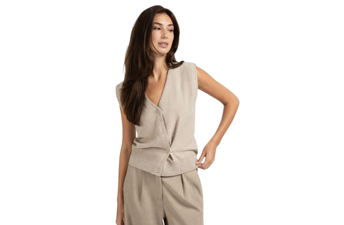 YAYA gilet 01-010120-508. Dit rechtvallende model heeft een diepe V-hals en is mouwloos. Deze zandkleurige gilet van YAYA is gedetailleerd met asymmetrische knoopsluitingen en heeft een brede ribgebreide zoom.