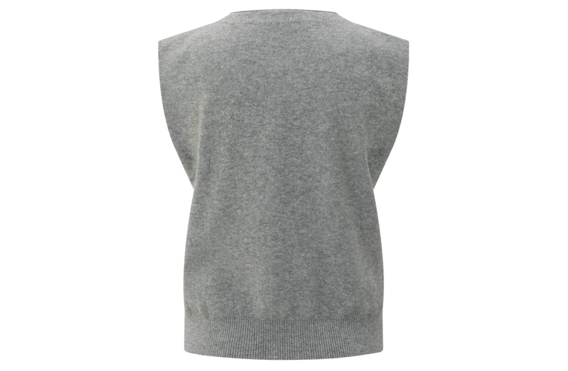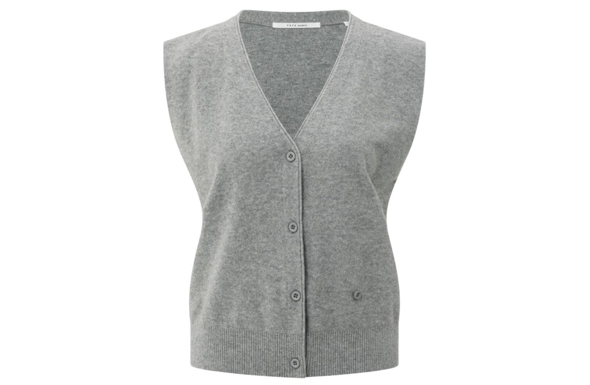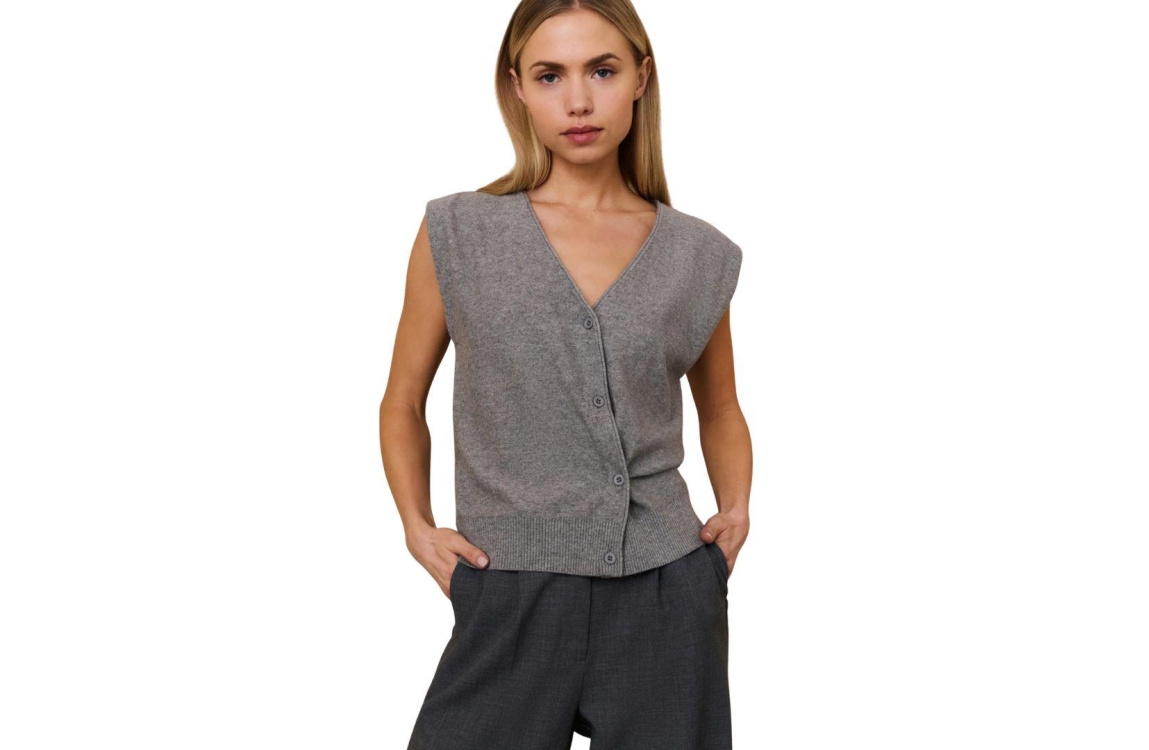 YAYA gilet 01-010120-508. Dit rechtvallende model heeft een diepe V-hals en is mouwloos. Deze grijze gilet van YAYA is gedetailleerd met asymmetrische knoopsluitingen en heeft een brede ribgebreide zoom.