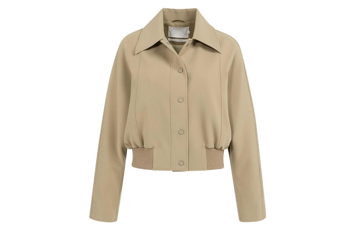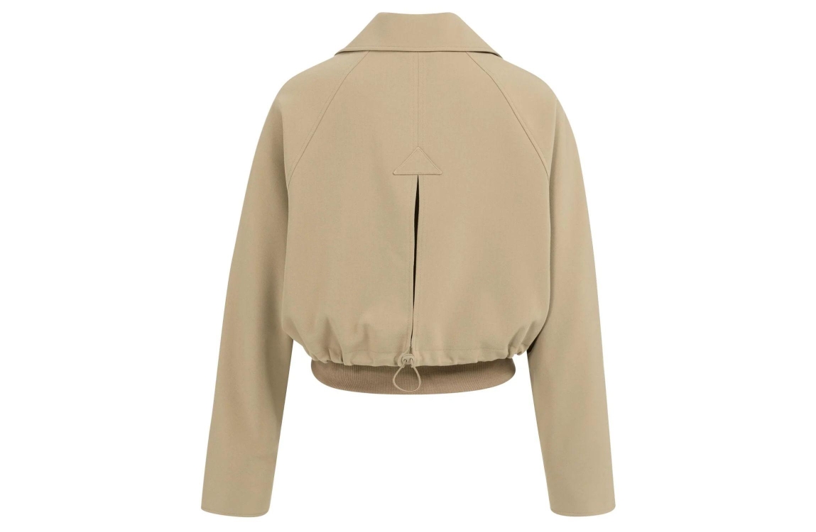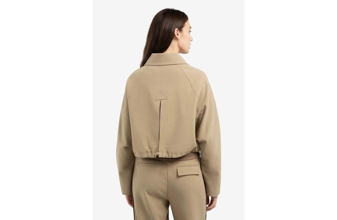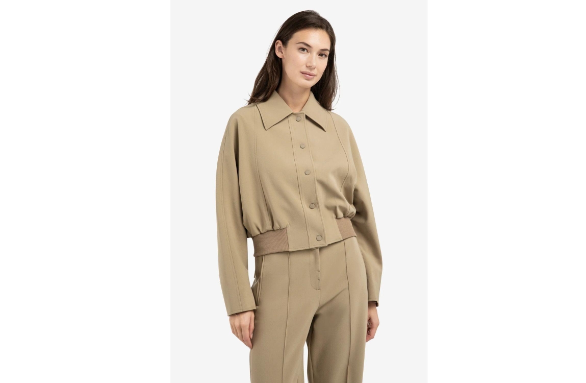 Yaya Kort jasje met ribboord 99045 Khaki green. Dit korte model heeft een kraag en lange mouwen. Deze khakigroene jas van Yaya sluit door middel van een drukknoopsluiting. Dit model heeft een verstelbaar koord aan de achterkant en een elastische ribboord.