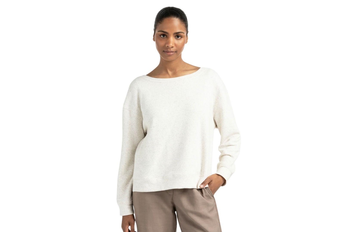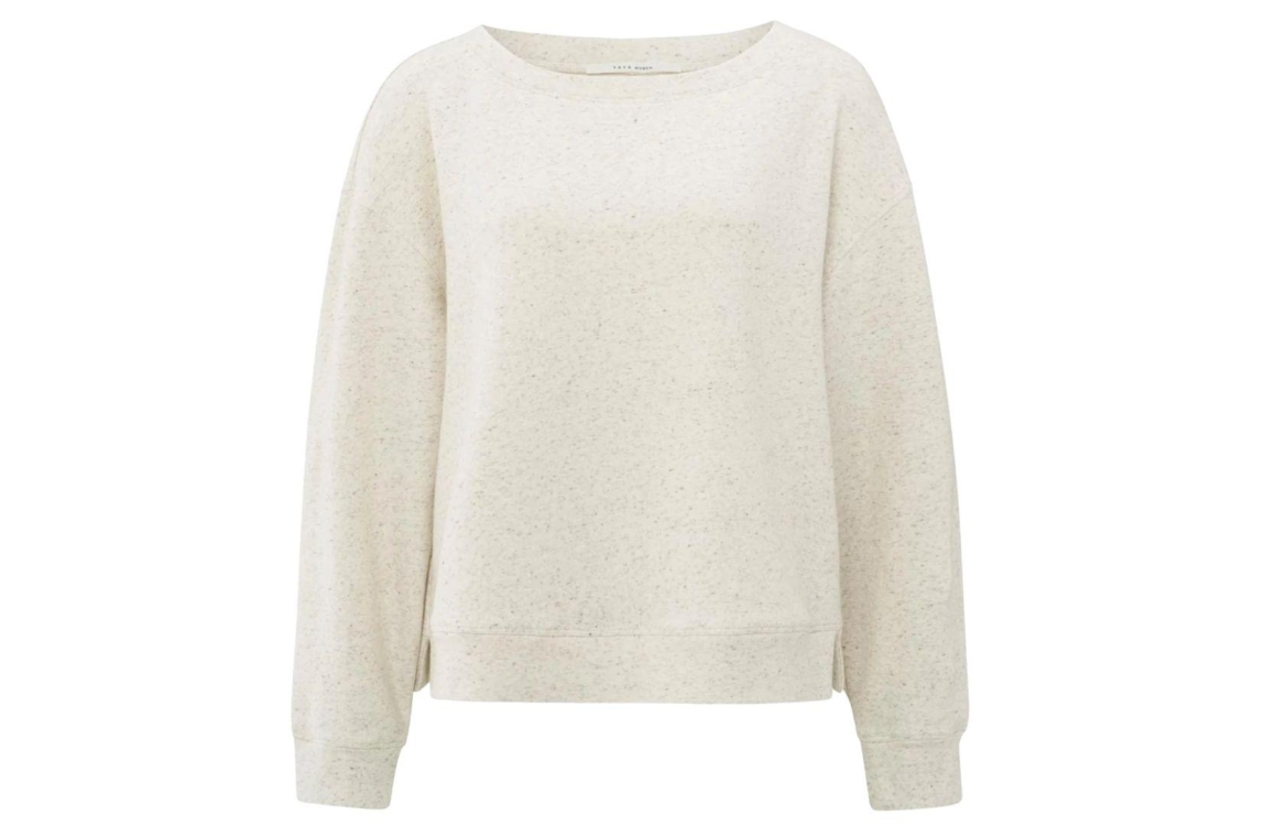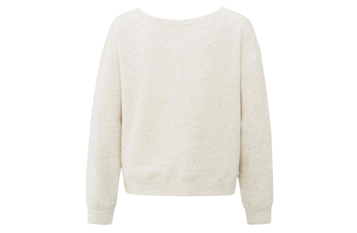Yaya sweatshirt 01-109090-507. Dit rechtvallend model heeft een boothals met verlaagde schoudernaden en lange mouwen. Deze off white sweatshirt van Yaya is all-over bewerkt met een gemêleerde stof en is afgewerkt met splitjes aan de zijkant.