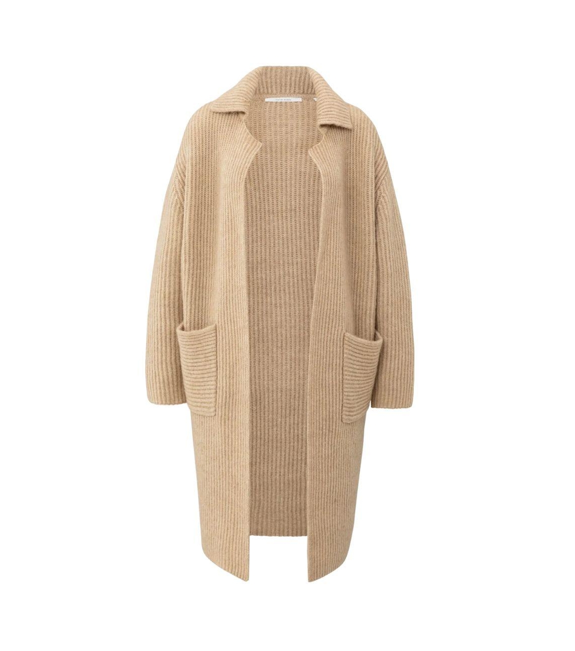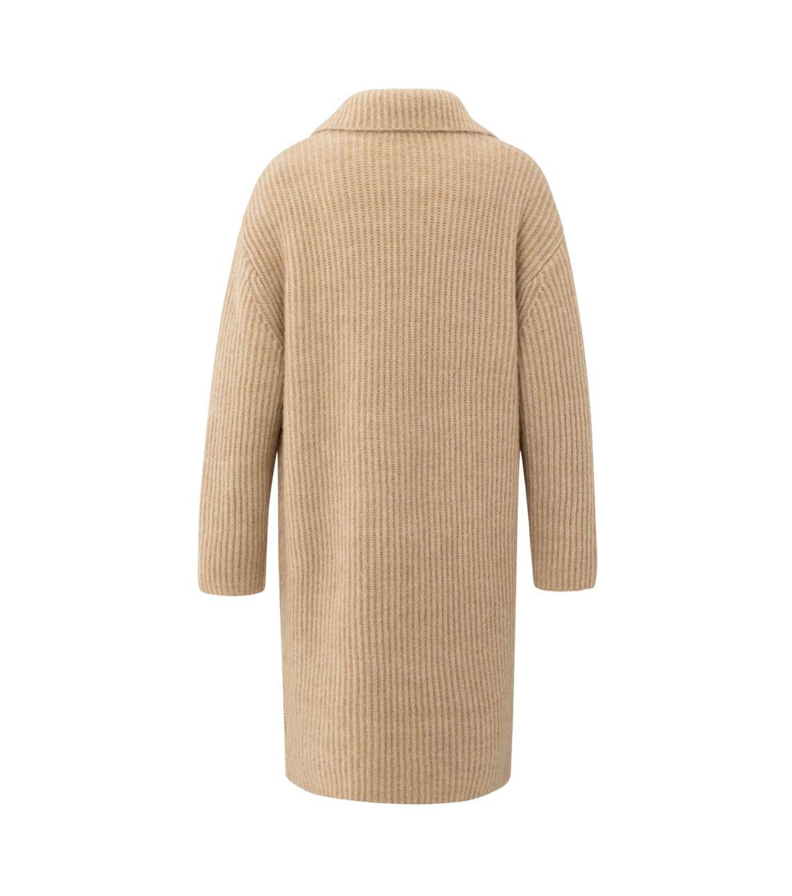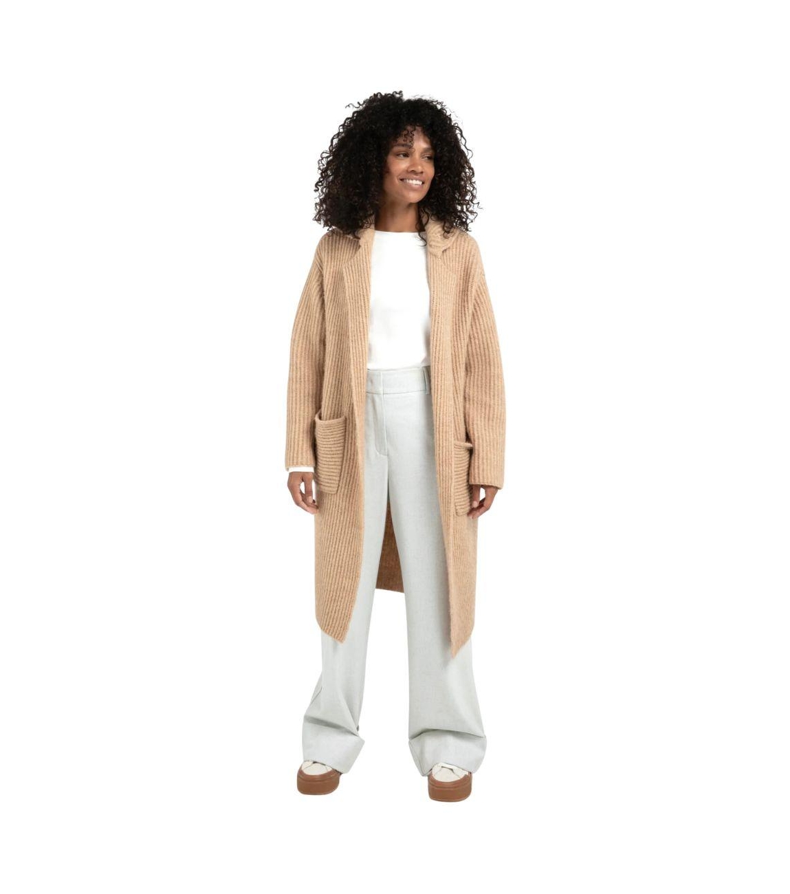 Yaya vest 01-010131-510 99030. Dit rechtvallende model heeft een omgeslagen kraag en lange mouwen. Deze lichtbruine vest van Yaya is uitgevoerd in ribstructuur en is voorzien van twee opgestikte zakken.