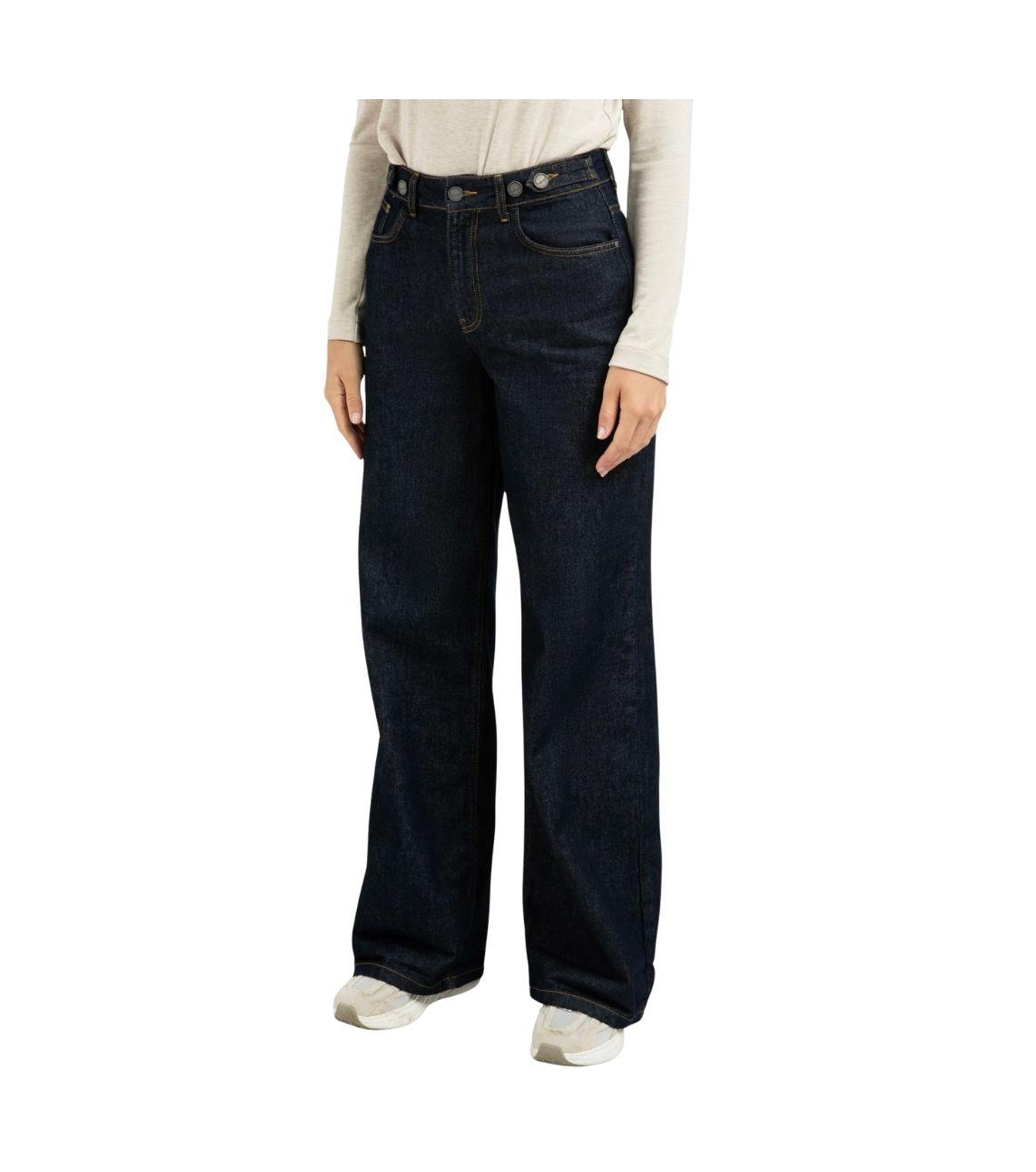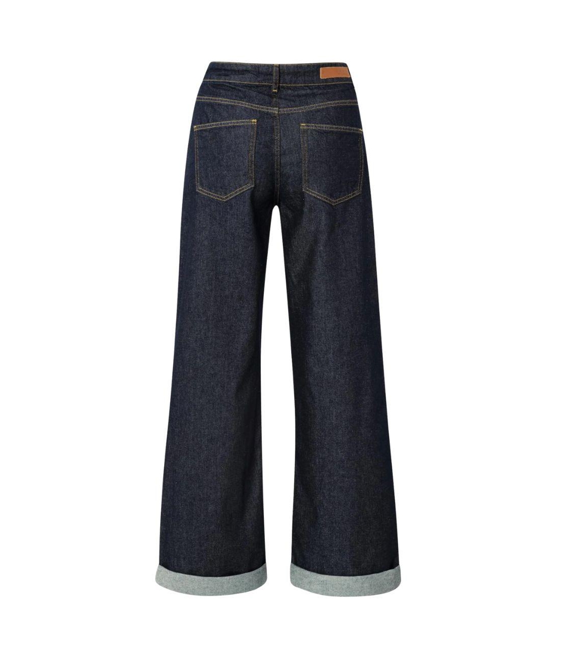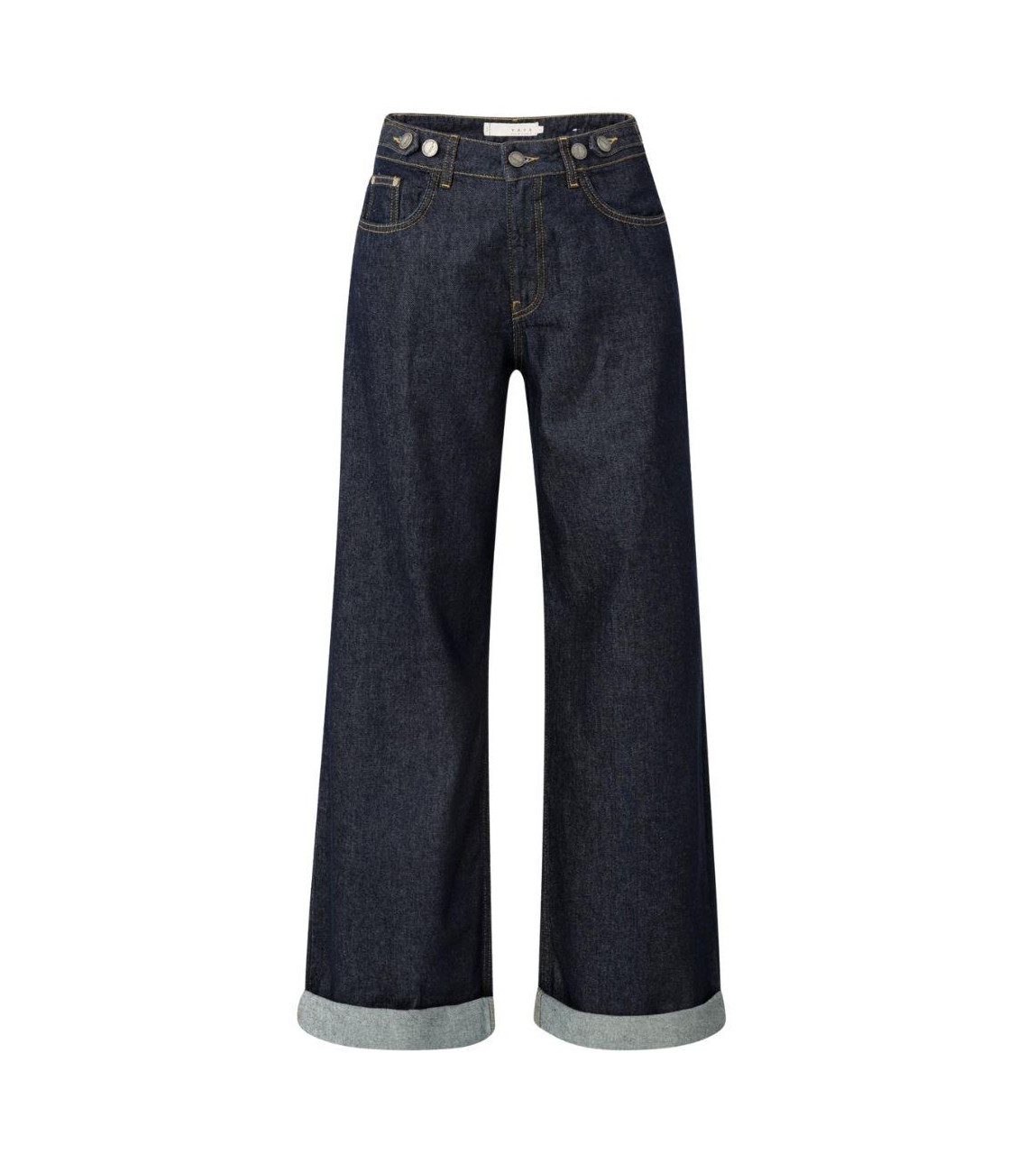 Yaya broek 01-311114-510. Dit wide leg model sluit door middel van een knoop- en ritssluiting en is voorzien van ceintuurlussen. Deze donkere denim broek van Yaya is voorzien van twee steekzakken aan de voor- en achterzijde met een muntenzakje.