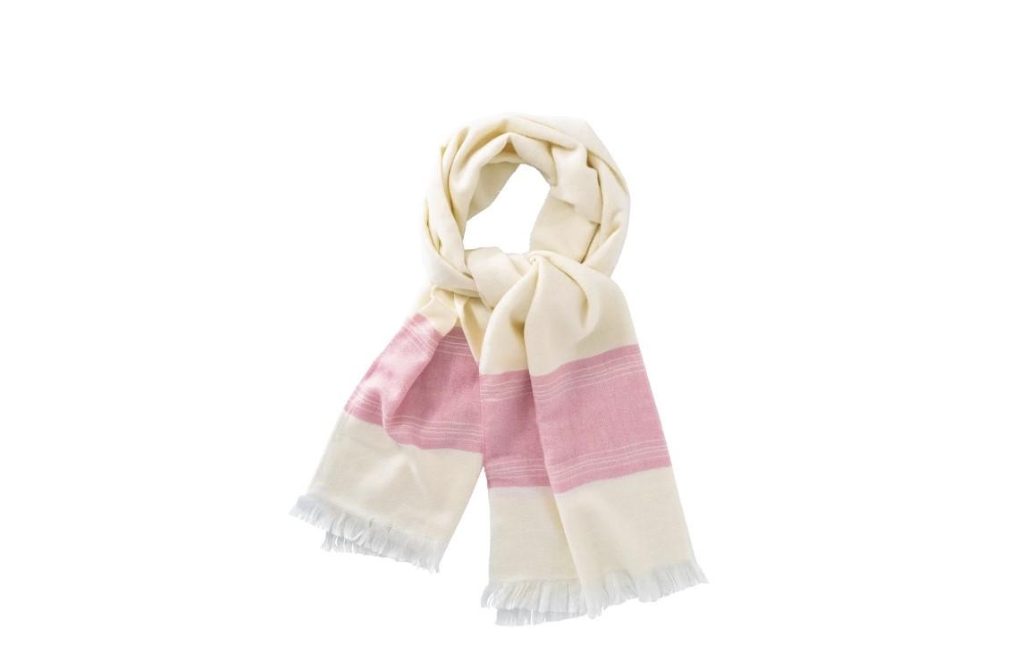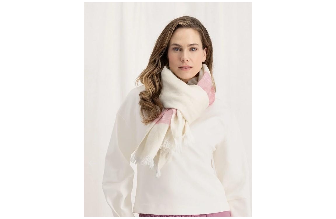 Yaya sjaal 03-501026-401. Dit rechthoekige model van Yaya is uitgevoerd met een roze baan en heeft gerafelde uiteinden.