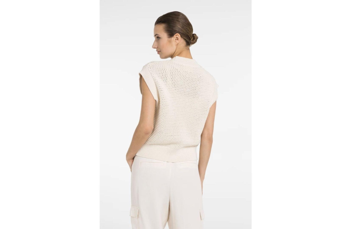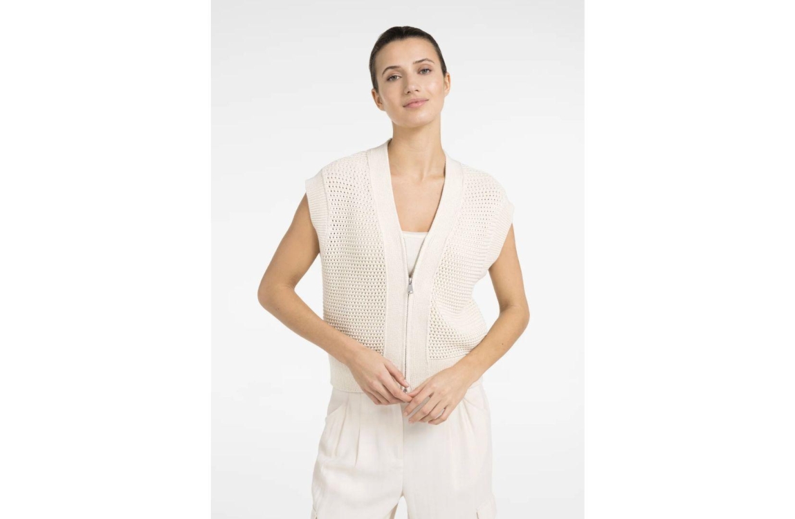 Yaya mesh stitch sleeveles cardigan 01-010154-604. Dit rechtvallend model is mouwloos en heeft een v-hals. Dit beige grofgebreide vest van Yaya sluit door middel van een dubbele rits en is opengewerkt uitgevoerd.