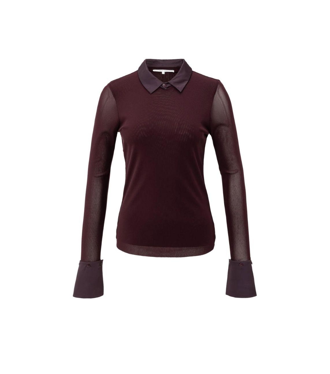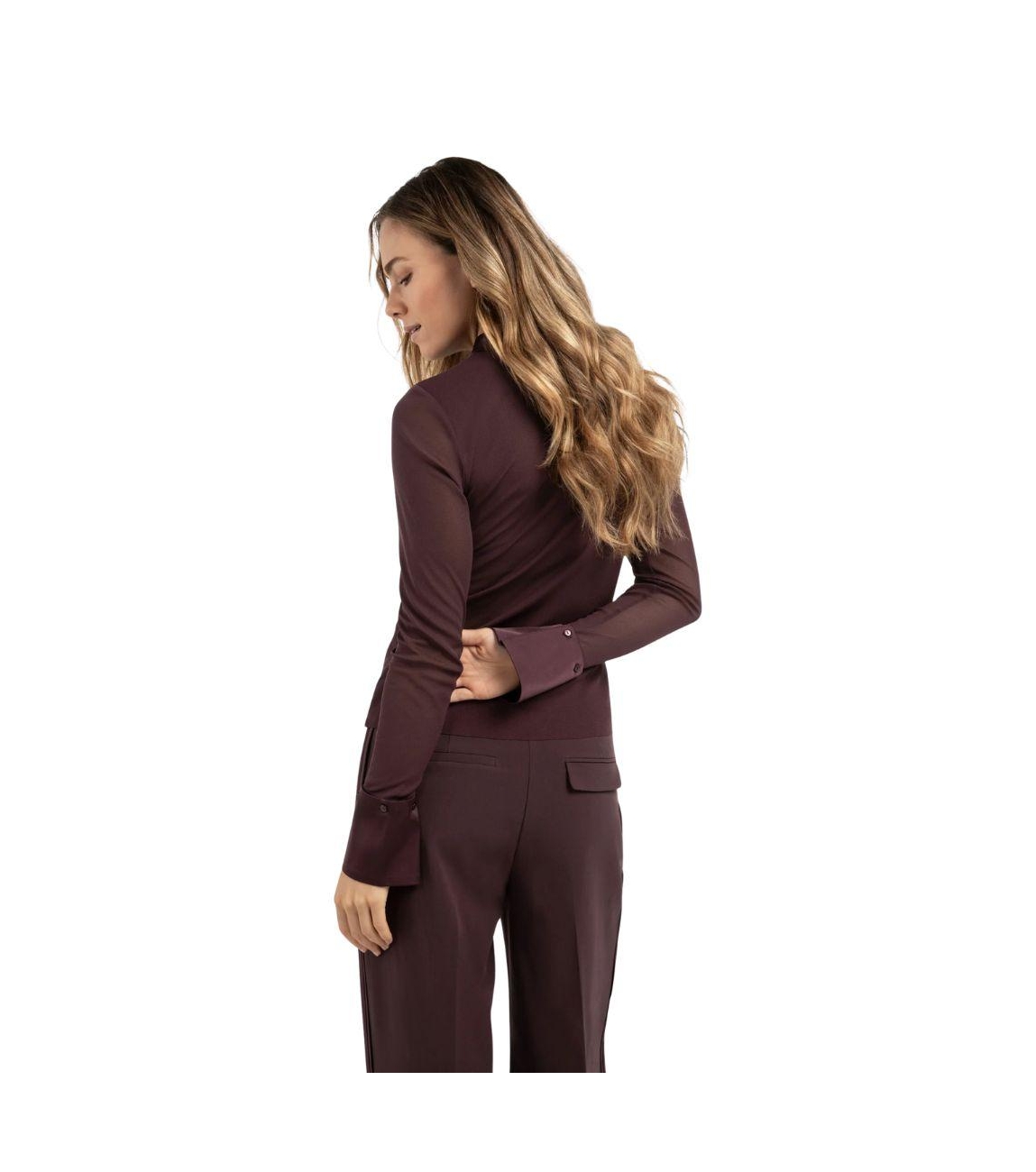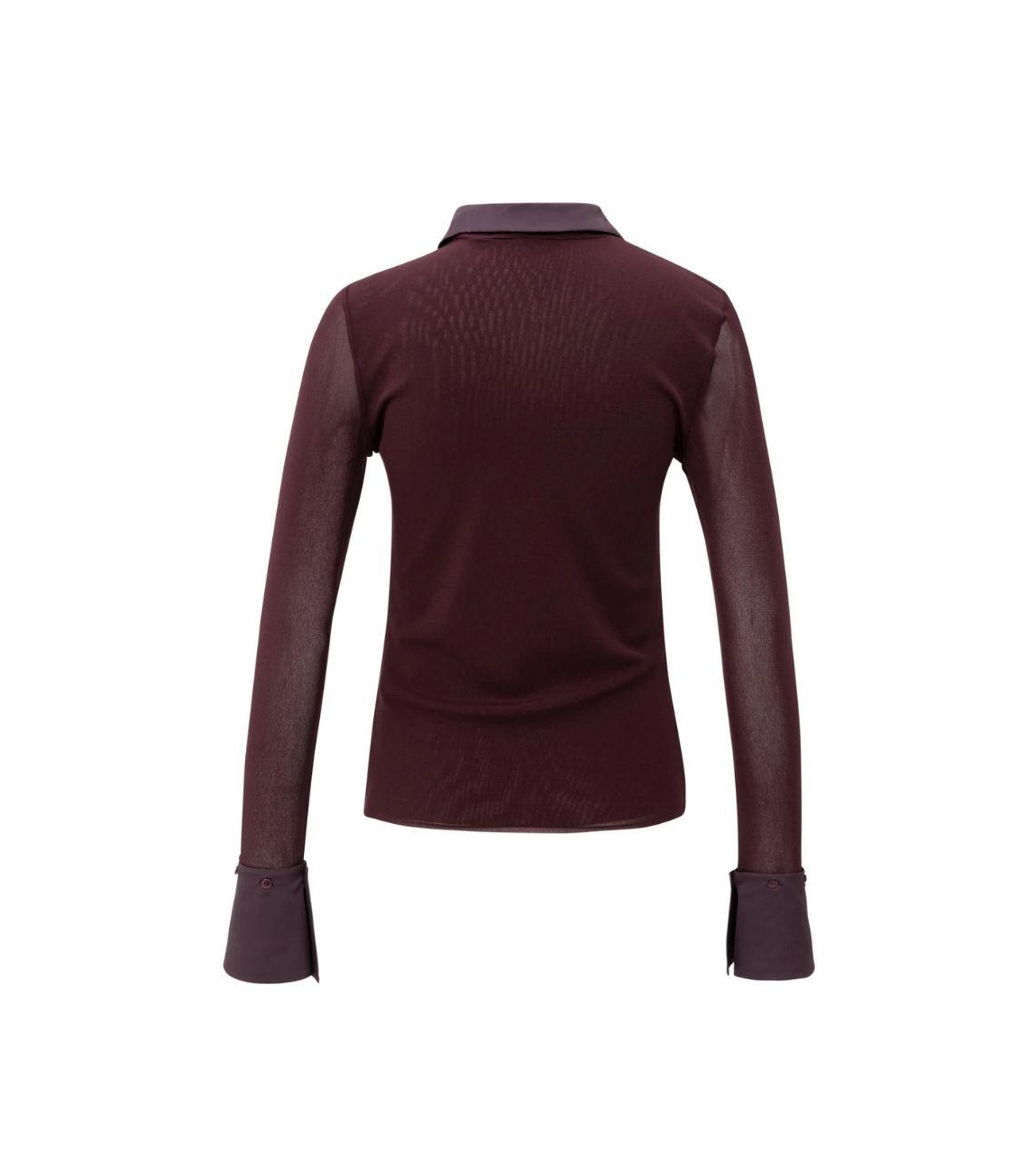 Yaya top 01-709346-611. Dit rechtvallend model is voorzien van een afneembare kraag en heeft lange mouwen afgewerkt met afneembare manchetten. Deze bordeauxrode top van Yaya is uitgevoerd in een meshkwaliteit.