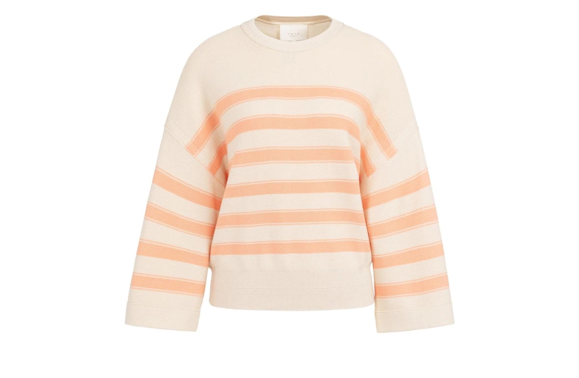 Yaya Mixing textured sweater with s 313072 Peach palazzo orange mel. Dit soepelvallende model is voorzien van een ronde hals en heeft verlaagde schouders en rechte, wijde mouwen. Deze beige sweater van Yaya is bewerkt met een oranje streepdessin. Dit model is afgewerkt met ribboorden aan de zoom en mouwen.