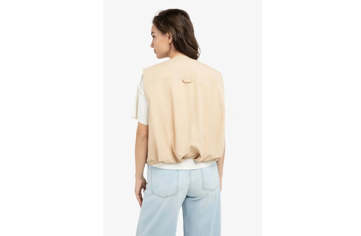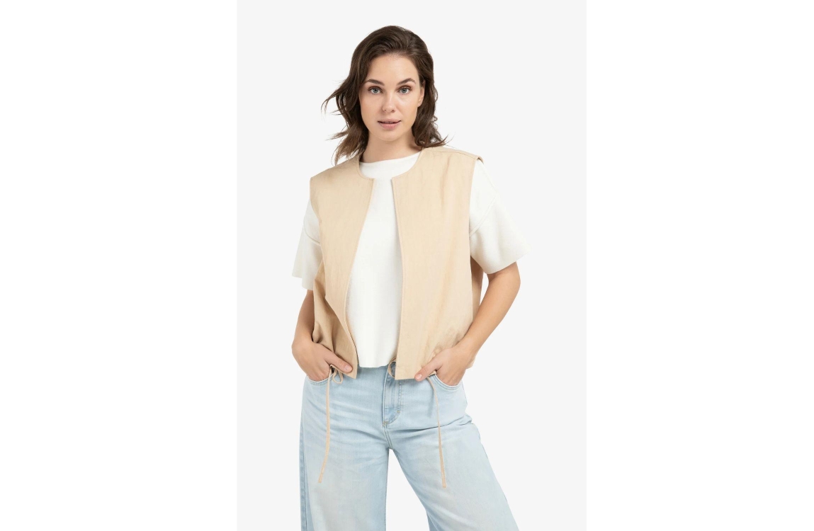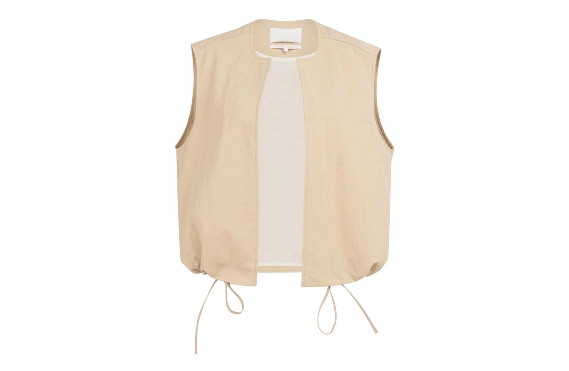 Yaya Mouwloos zomerjack 99052 Desert beige. Dit rechtvallende model is voorzien van een ronde hals en is mouwloos. Dit beige zomerjack van Yaya heeft een open voorkant en trekkoorden aan de zoom. Dit model is afgewerkt met een decoratieve lus op de rug.