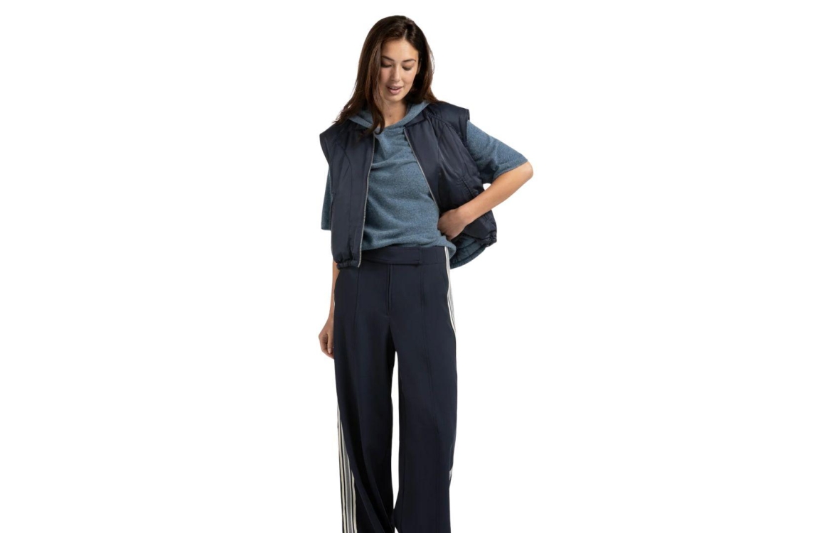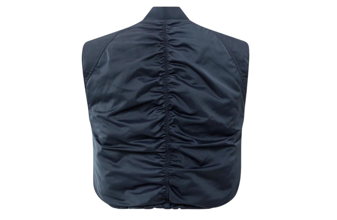 Yaya bodywarmer 02-021005-508. Dit losvallende model heeft een opstaande, geribde kraag en is mouwloos. Deze donkerblauwe bodywarmer van Yaya is omkeerbaar en biedt twee verschillende looks in één en heeft een elastische zoom.