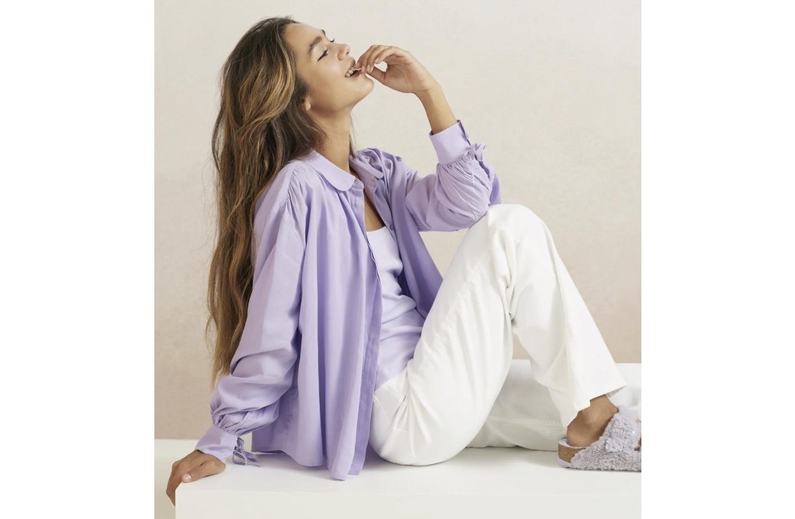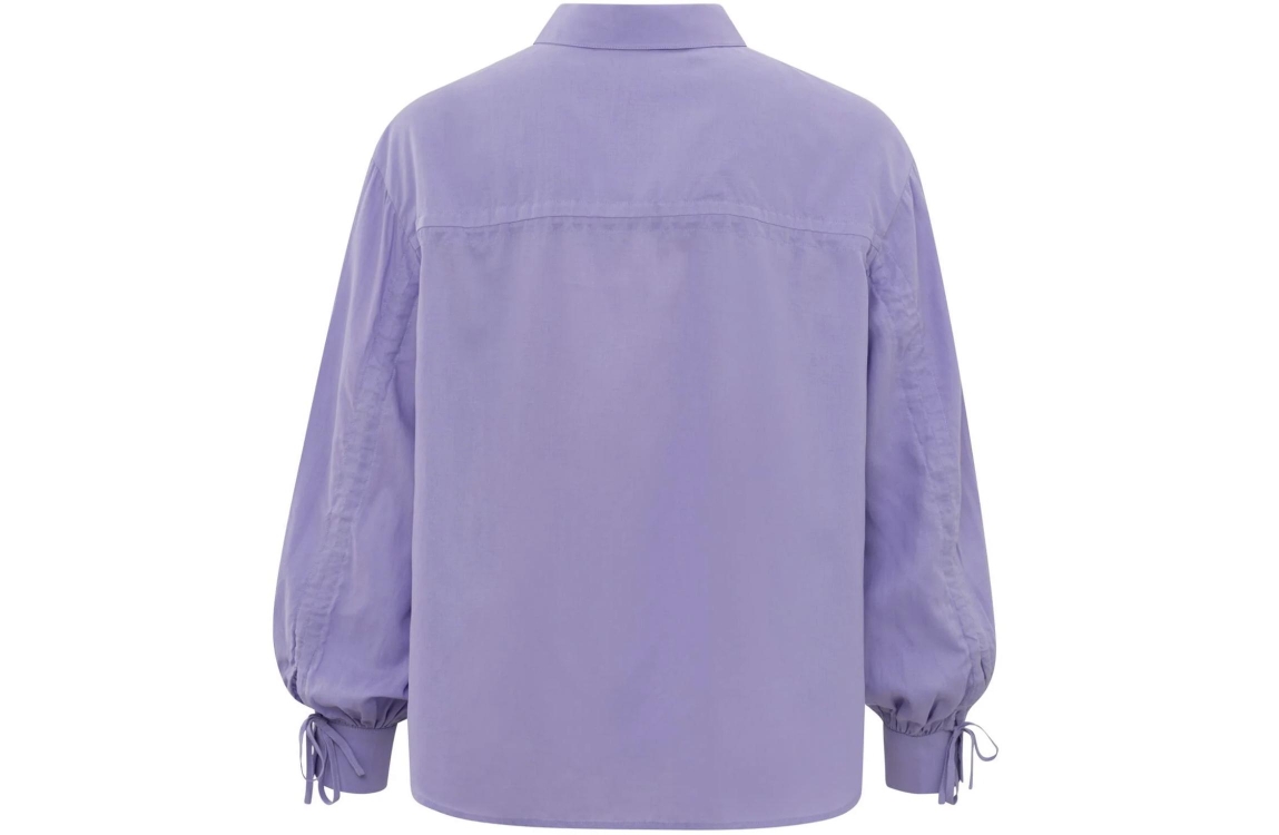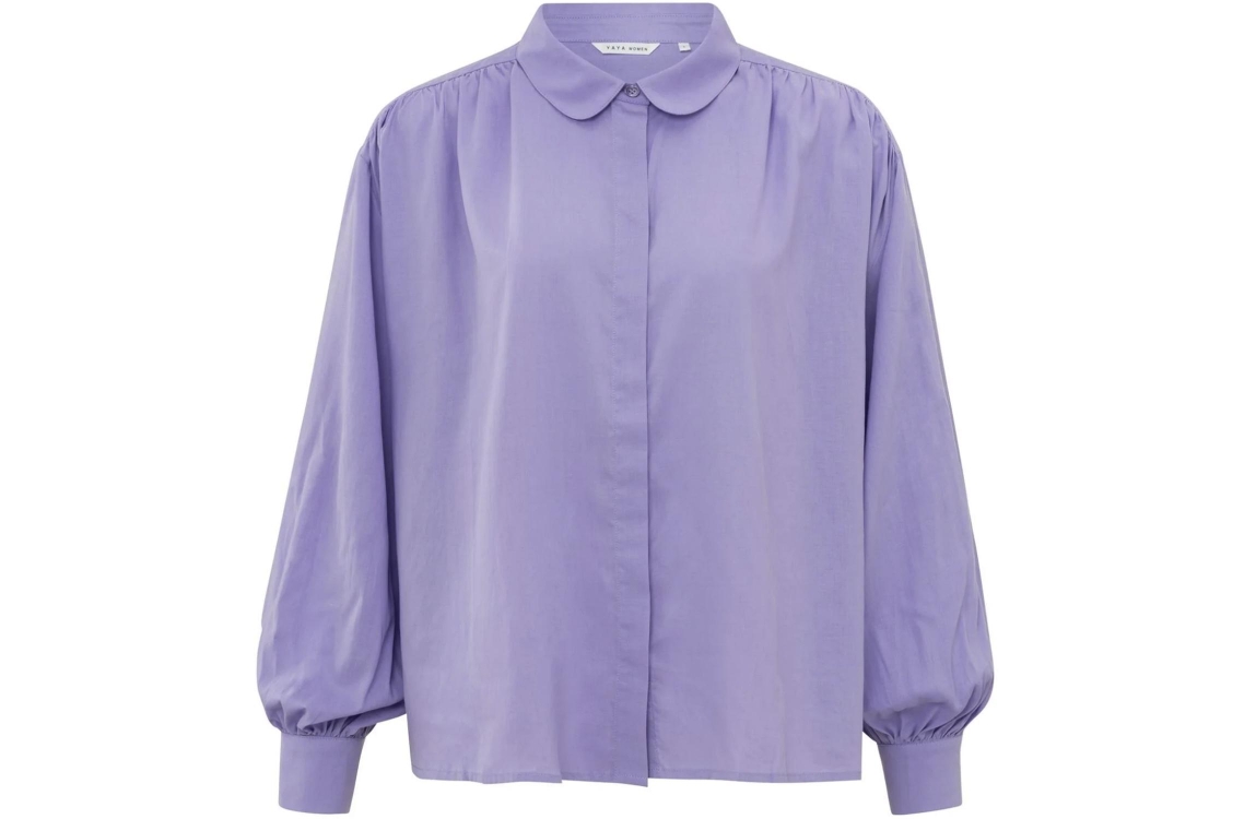 Yaya blouse 01-201077-404. Dit oversized model is voorzien van een kraag en heeft lange mouwen afgewerkt met strikjes. Deze paarse blouse van Yaya sluit door middel van knopen en is afgewerkt met plissédetails.