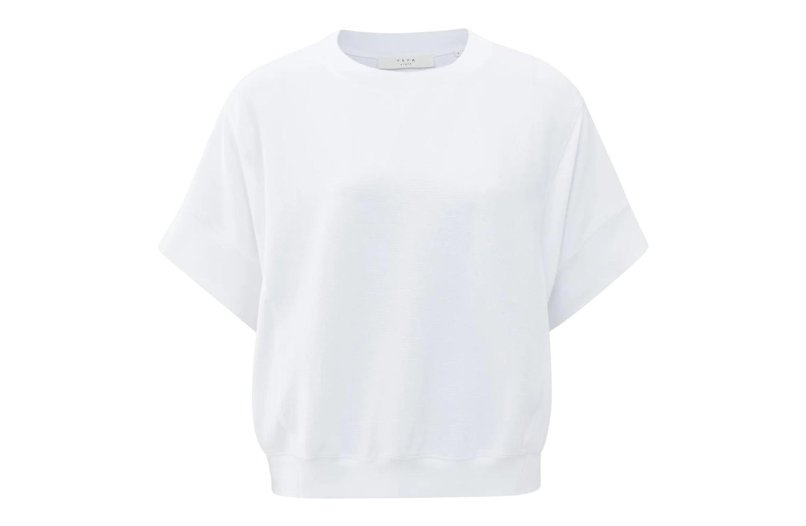 Yaya Ribbed jersey top 01-709313. Dit loose fit model heeft een ronde hals en korte mouwen. Deze witte top van Yaya is uitgevoerd in een ribstof-materiaal en beschikt over elastische boorden aan de onderzijde.