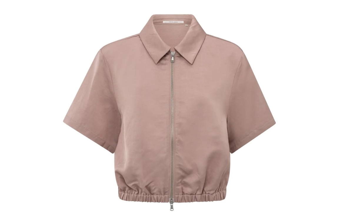 Yaya jacket 02-001050-505. Dit cropped model heeft een kraag, korte mouwen en sluit door middel van een rits. Dit roze jacket van Yaya is uitgevoerd met een elastische boord aan de onderzijde en gemaakt van een satin look en feel.