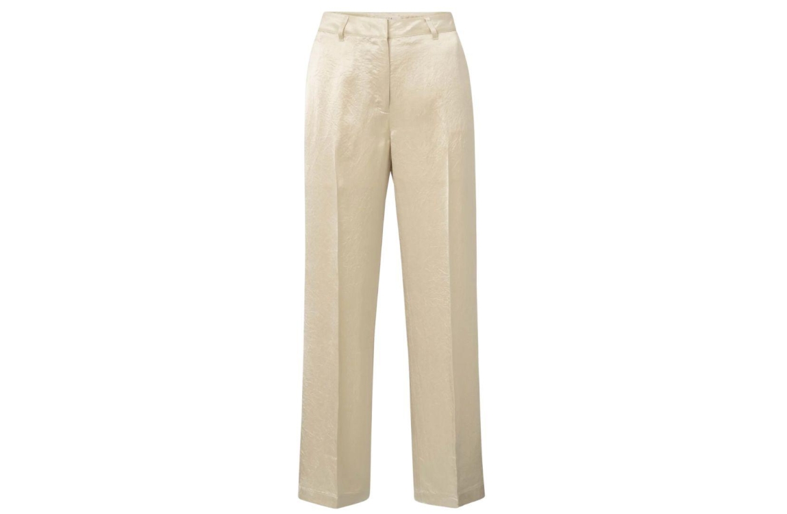 Yaya online broek 01-301195-505. Dit wijdvallend model sluit door middel van een knoop- en ritssluiting en is voorzien van ceintuurlussen. Deze zandkleurige broek van Yaya beschikt over twee steekzakken aan de voorzijde en twee paspelzakken aan de achterzijde. Het model is uitgevoerd in een satijnen-look en is gedetailleerd met een plooi over de lengte.