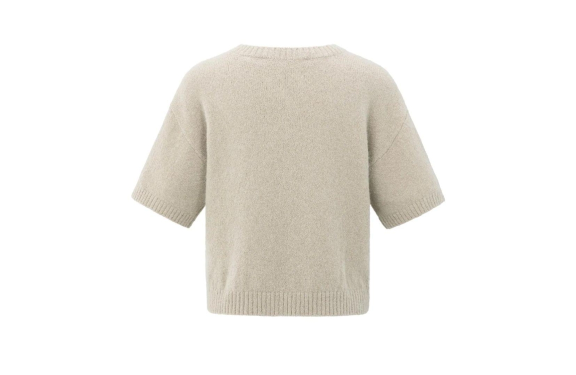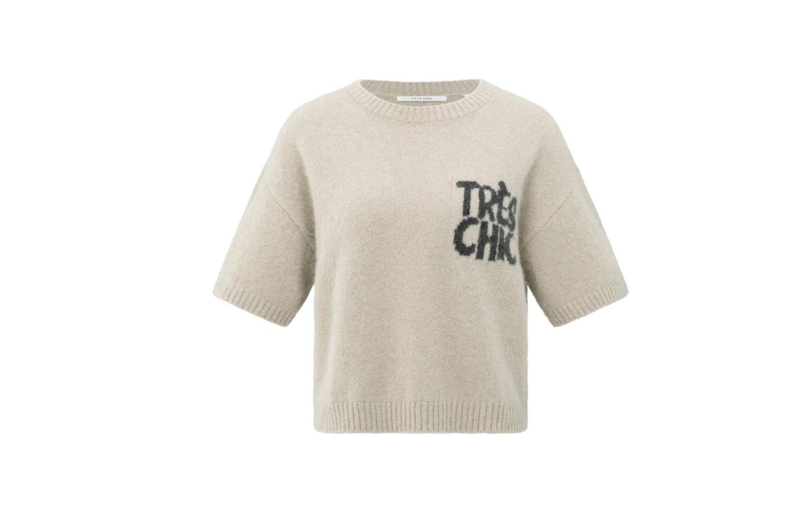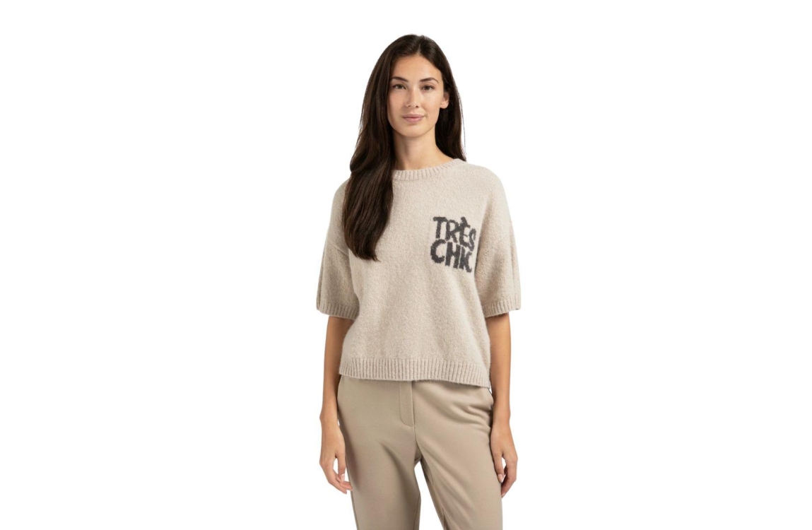Yaya sweater 01-000485-508. Dit rechtvallend model is voorzien van een ronde hals en heeft krote mouwen. Deze beige sweater is bewerkt met Très Chic artwork op de borst.