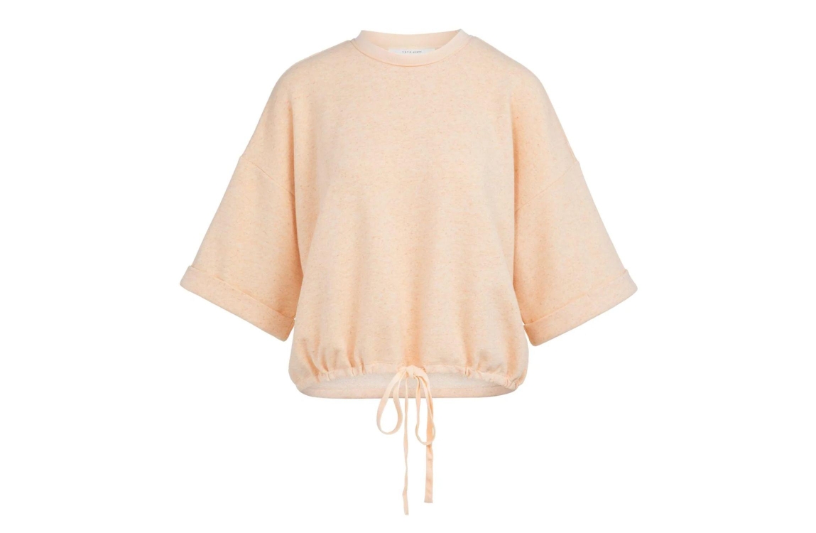 Yaya Short sleeve sweatshirt with r 412172 Amberlight mel. Dit wijdvallende model is voorzien van een ronde hals en heeft korte, wide mouwen met vaste omslag. Dit oranje sweatshirt van Yaya is afgewerkt met een verstelbaar strikkoord in de zoom. Dit model is gemaakt van een zachte, licht gemêleerde sweatstof.