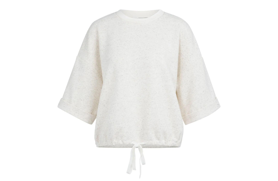 Yaya Short sleeve sweatshirt with r 990642 Ivory white mel. Dit wijdvallende model is voorzien van een ronde hals en heeft korte, wide mouwen met vaste omslag. Dit grijze sweatshirt van Yaya is afgewerkt met een verstelbaar strikkoord in de zoom. Dit model is gemaakt van een zachte, licht gemêleerde sweatstof.