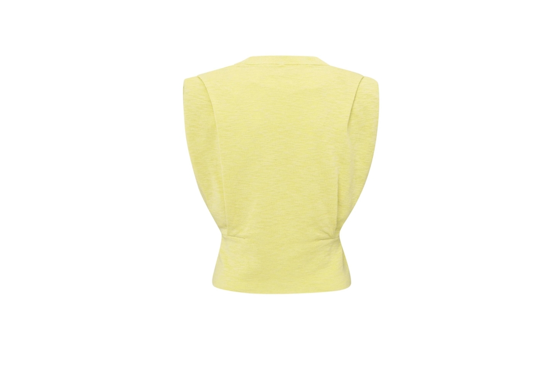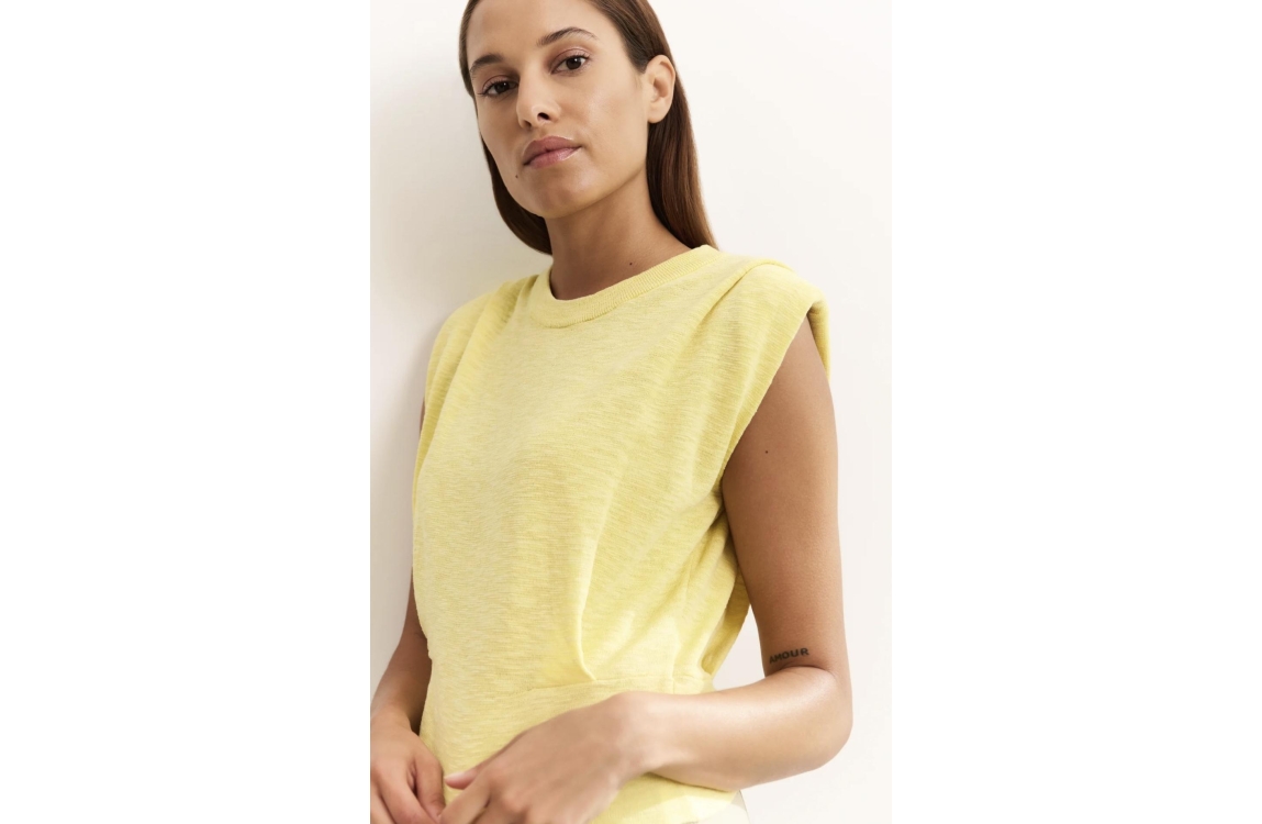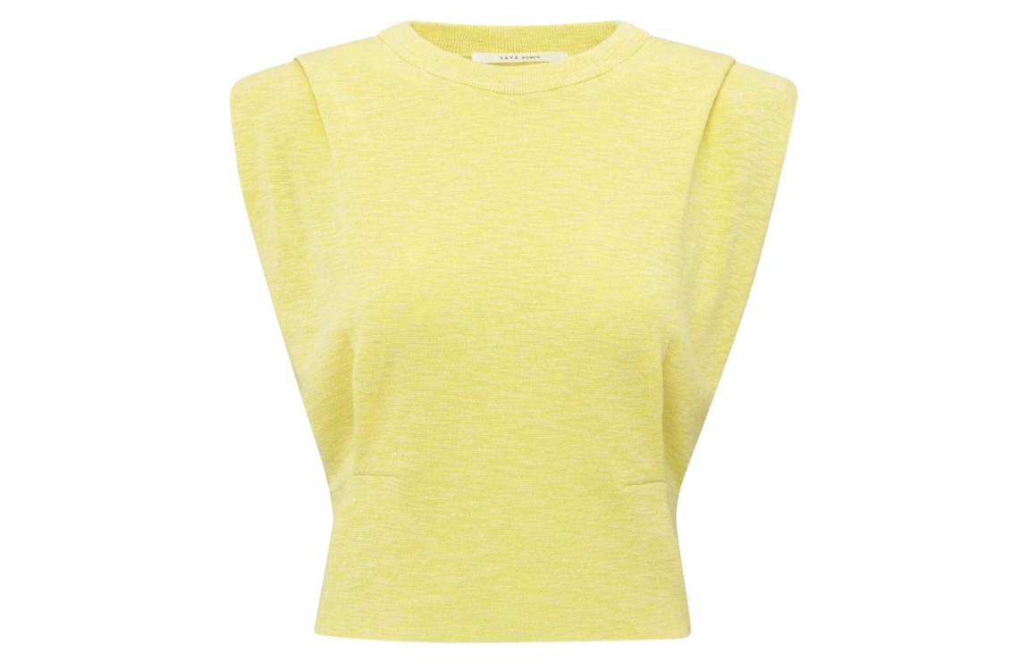 Yaya online top 01-000465-504. Dit rechtvallend model heeft een ronde hals en is mouwloos. Deze gele top van Yaya is voorzien van schoudervulling en is aan de voorzijde bewerkt met plooidetails.