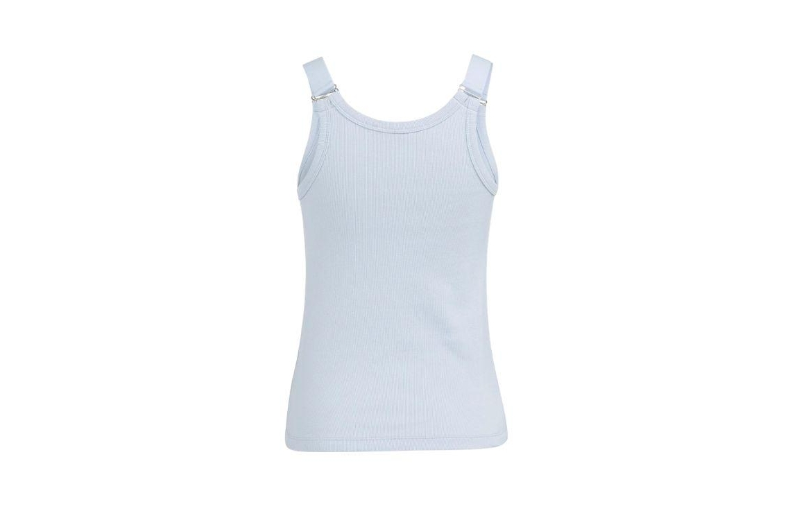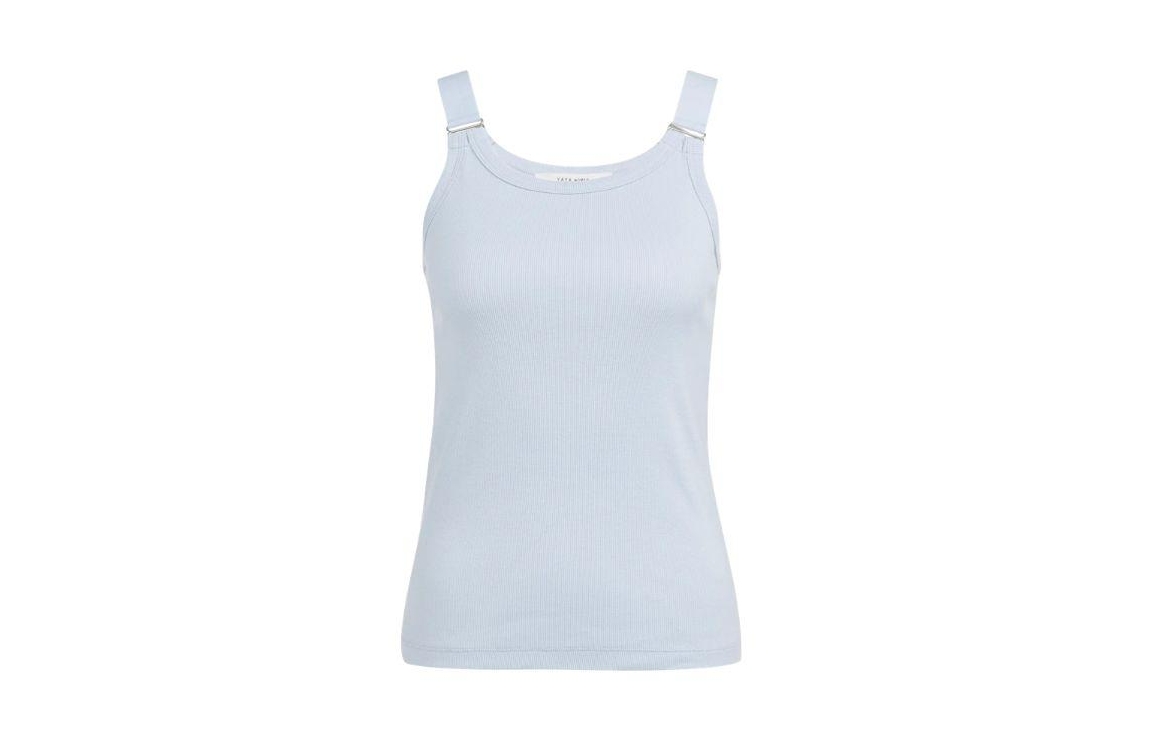 Yaya singlet 01-729050-603 99048. Dit aangesloten model heeft een ronde halslijn en elastische schouderbanden. Deze lichtblauwe singlet van Yaya is uitgevoerd in een geribde kwaliteit en is afgewerkt met zilverkleurige ringdetails.