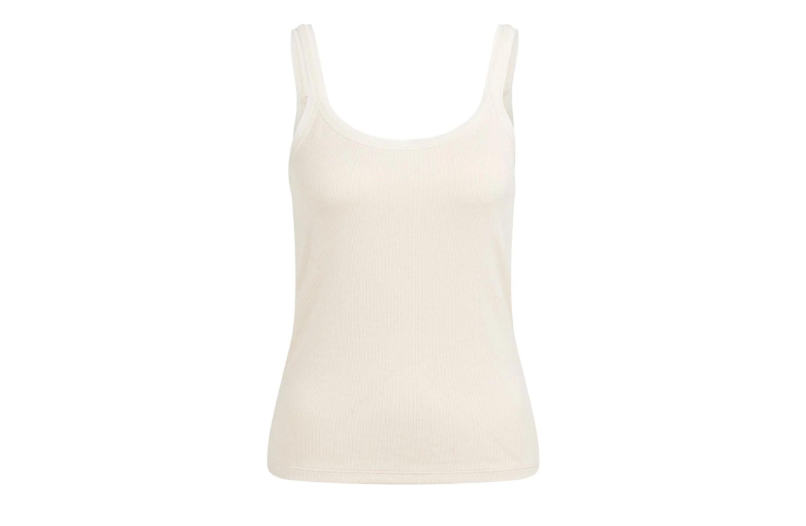 Yaya Singlet with mesh edge 99058 Creme beige. Dit aangesloten model is voorzien van een ronde hals en is mouwloos. Deze beige top van Yaya is afgewerkt met subtiele mesh afwerking langs de hals en bandjes.