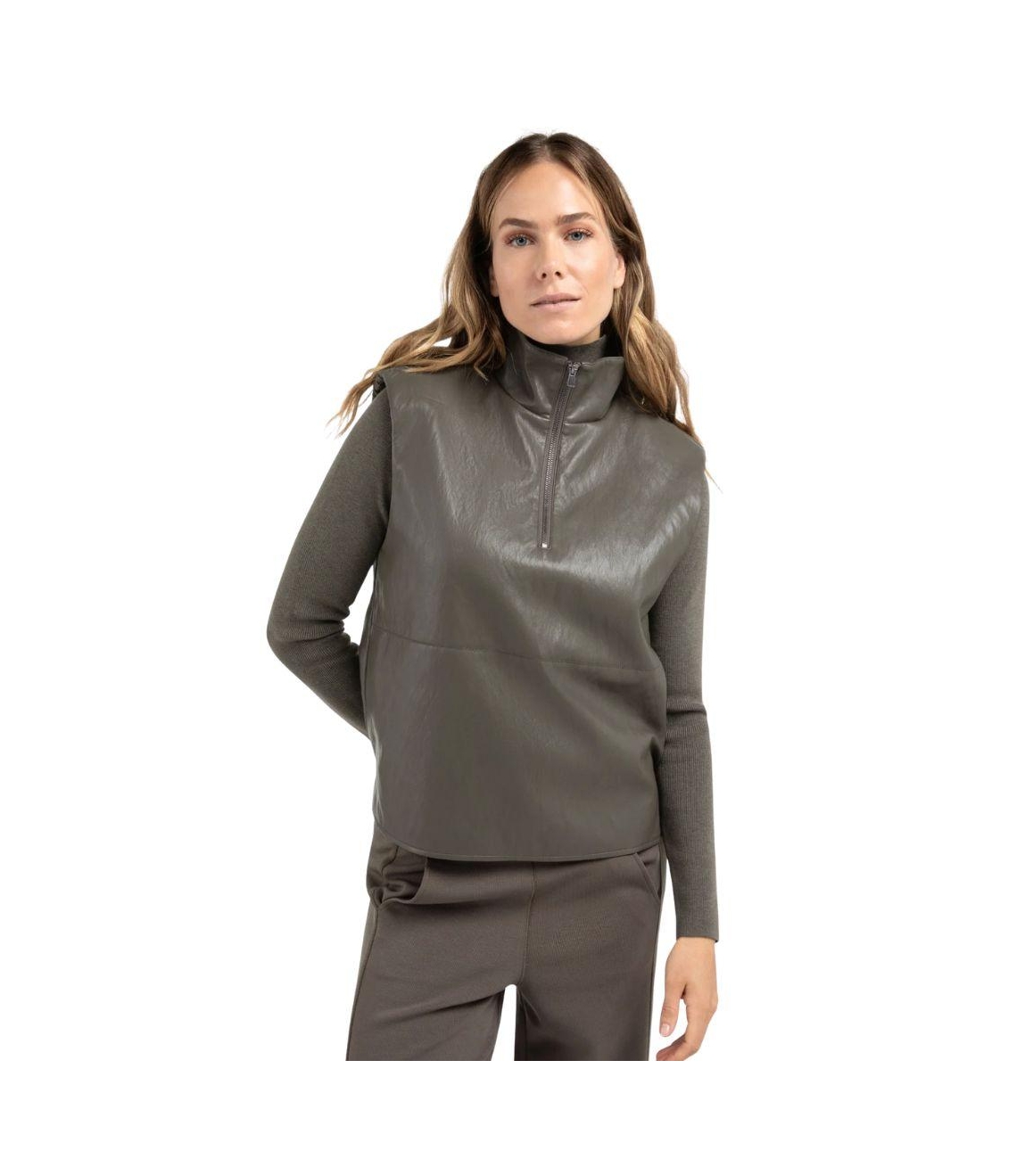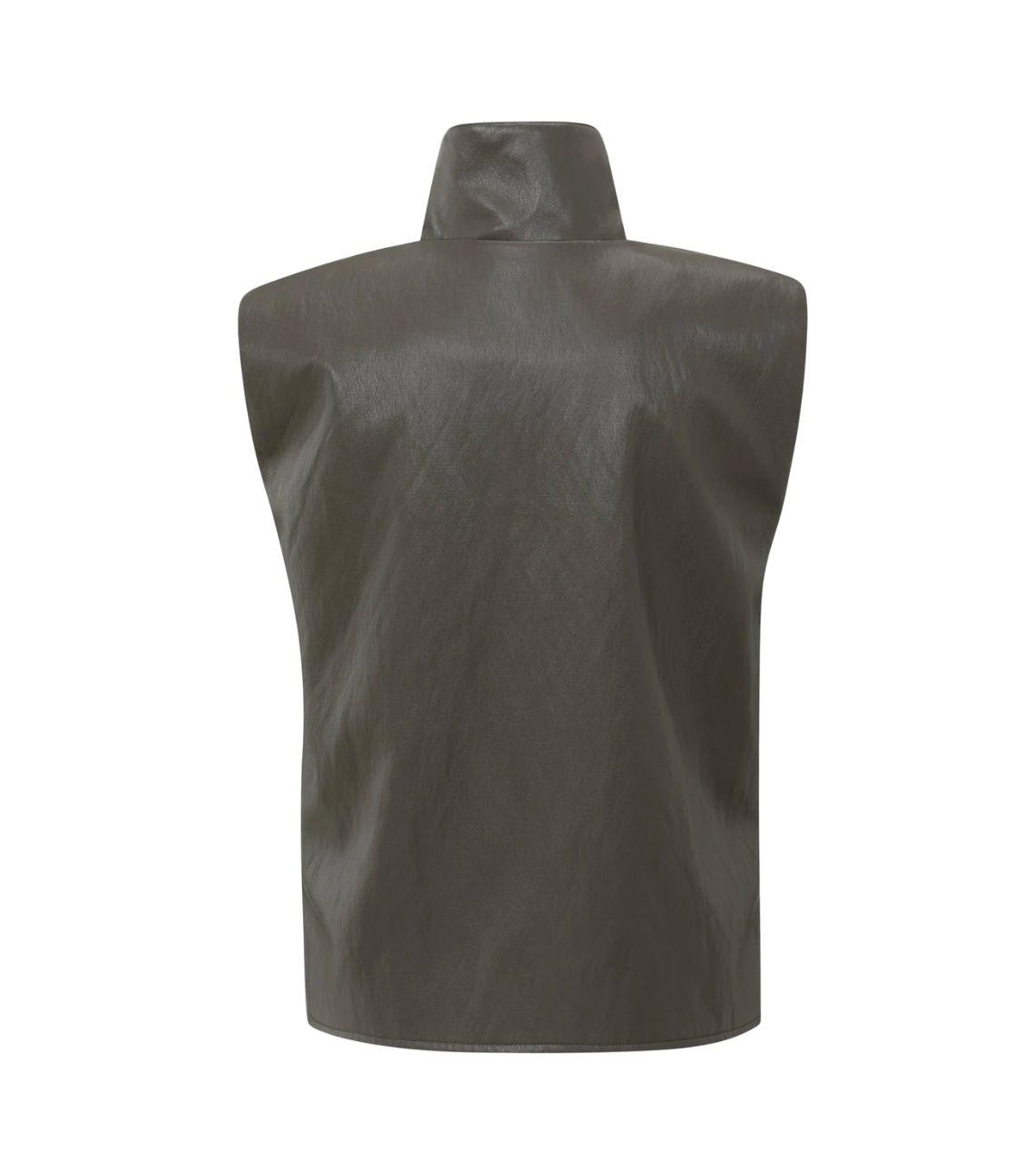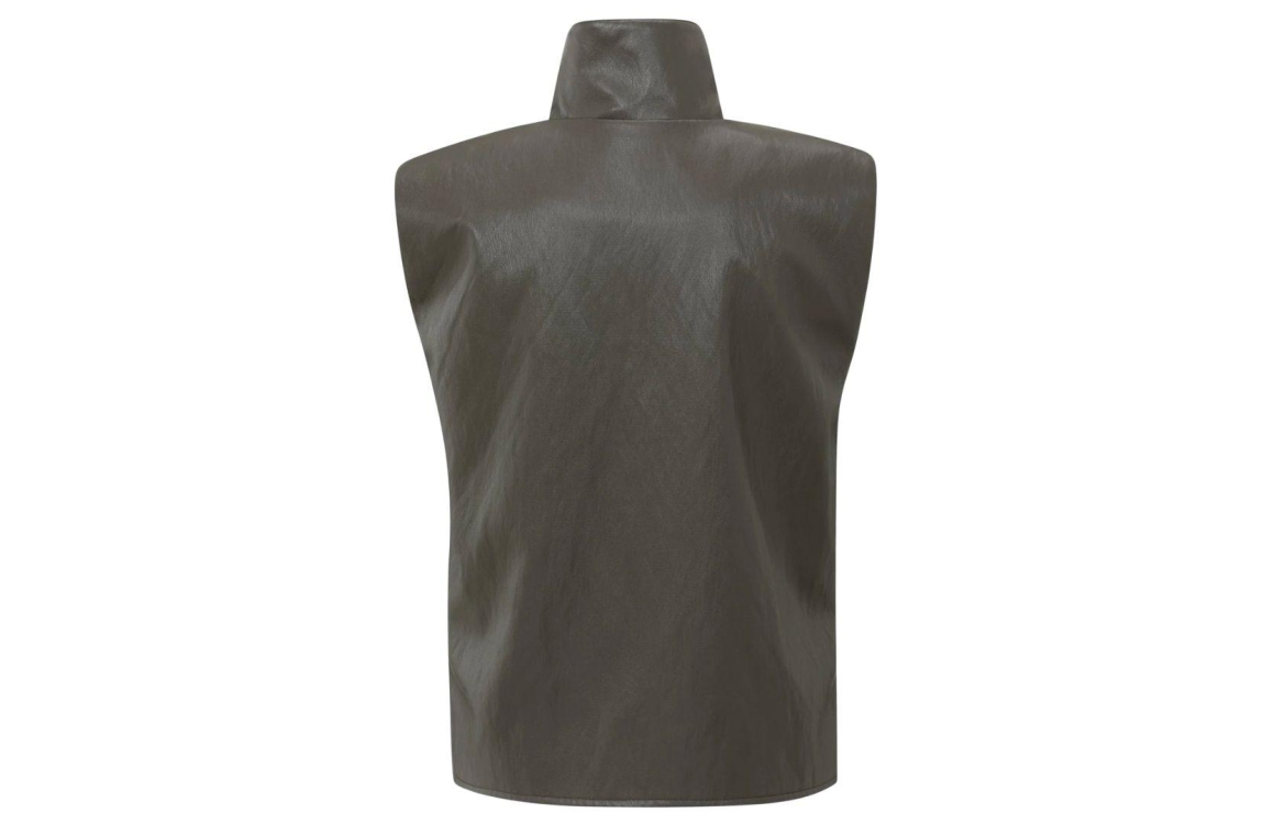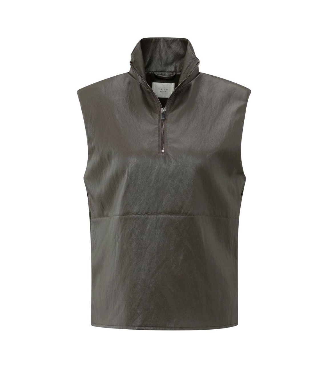 Yaya top hirt01-029005-510. Dit rechtvallende model heeft een opstaande kraag en is mouwloos. Deze grijze top van Yaya sluit aan de voorzijde door middel van een rits en is uitgevoerd in een leren-look.