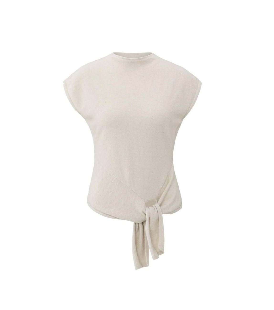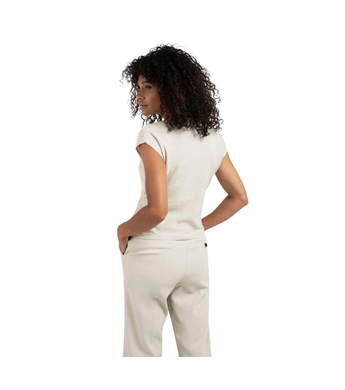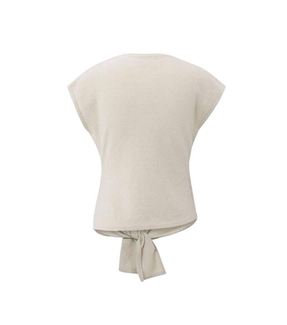 Yaya top 01-000534-511. Dit aangesloten model is voorzien van een ronde hals en heeft korte mouwen. Deze lichtgrijze top van Yaya is bewerkt met pailletten en is afgewerkt met een knoopdetail aan de onderzijde.
