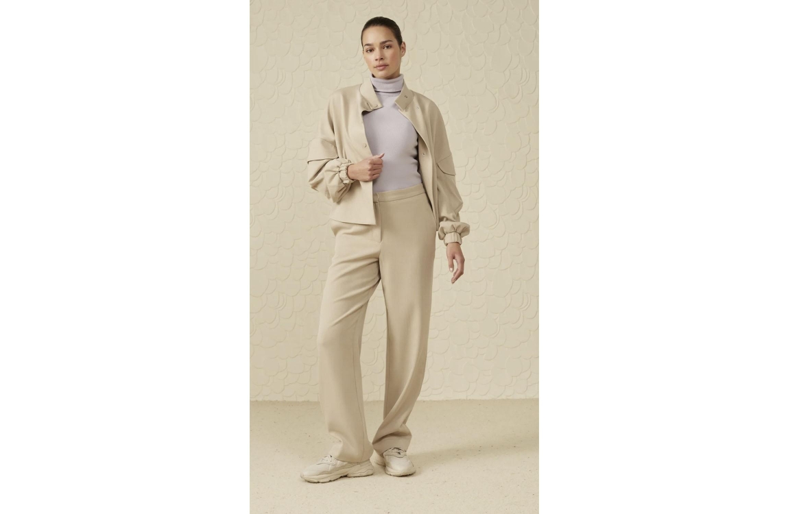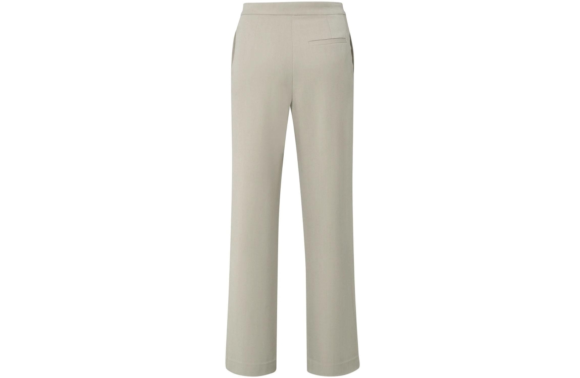 Yaya pantalon 01-301077-308. Dit wide leg model sluit door middel van een blinde knoop- en ritssluiting. Deze hoge lichtbruine pantalon van Yaya is voorzien van twee steekzakken aan de voorzijde en een papselzak aan de achterzijde.