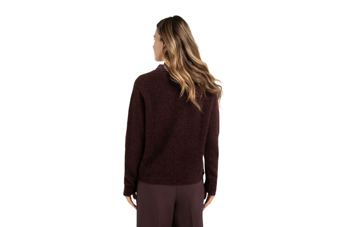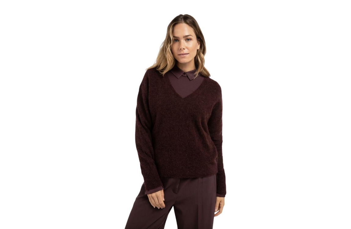 Yaya trui 01-000536-511. Dit rechtvallend model is voorzien van een v-hals en heeft lange mouwen. Deze bordeauxrode trui van Yaya is uitgevoerd in een wol kwaliteit.