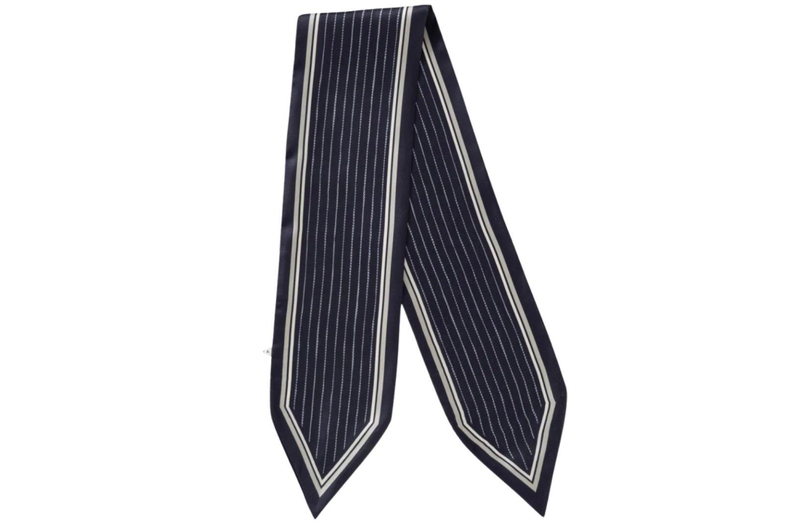 Yaya sjaal 03-501044-508. Deze donkerblauwe sjaal van YAYA is gemaakt van soepelvallende stof met een subtiele glans. De sjaal is all-over voorzien van een witte streepprint, omlijst met een gedetailleerde rand en uitgevoerd in een smal, langwerpig model.