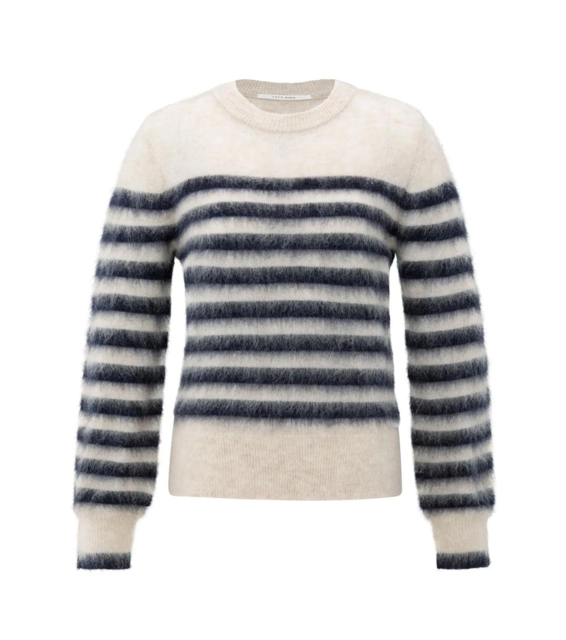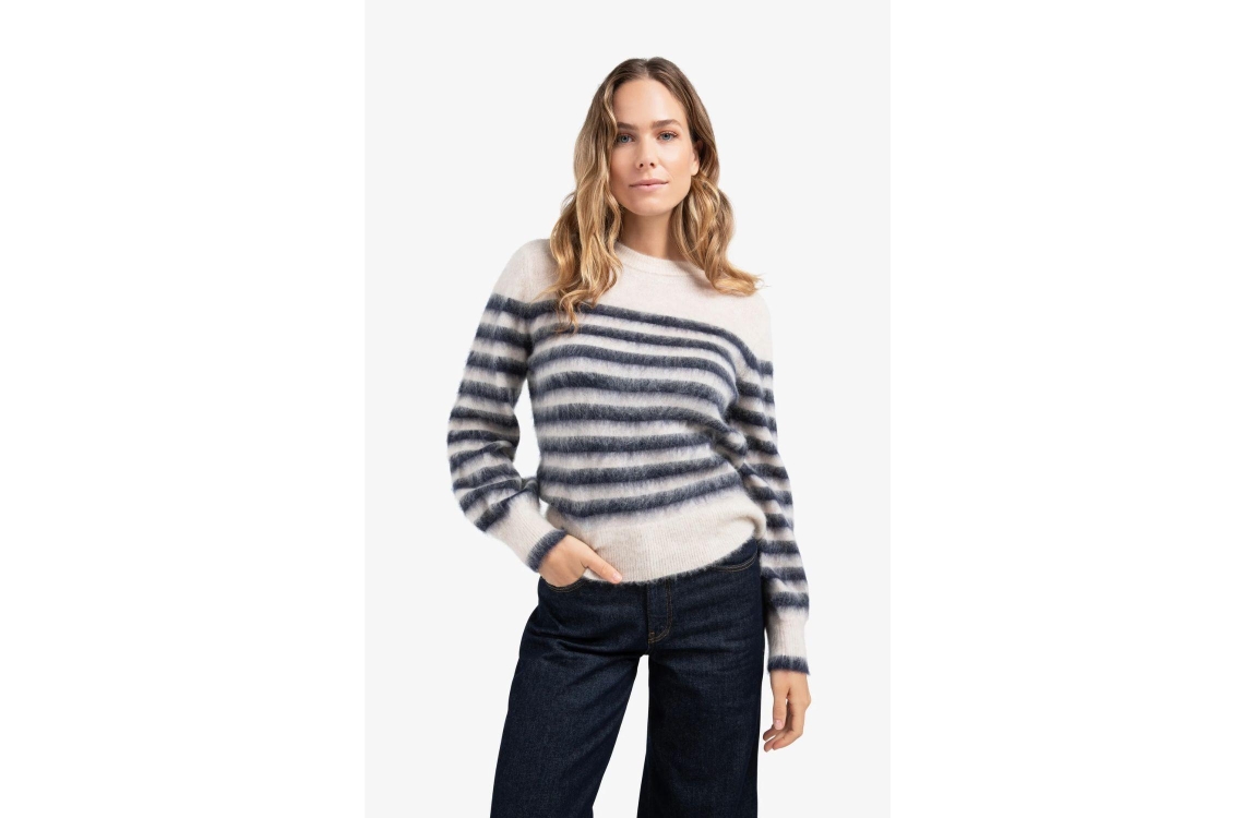 Yaya Striped sweater 940511 Collegiate blue dessin. Dit rechtvallende model is voorzien van een ronde hals en heeft lange mouwen. Deze beige met donker blauw gestreepte trui van Yaya is gemaakt van een warme wolmix.