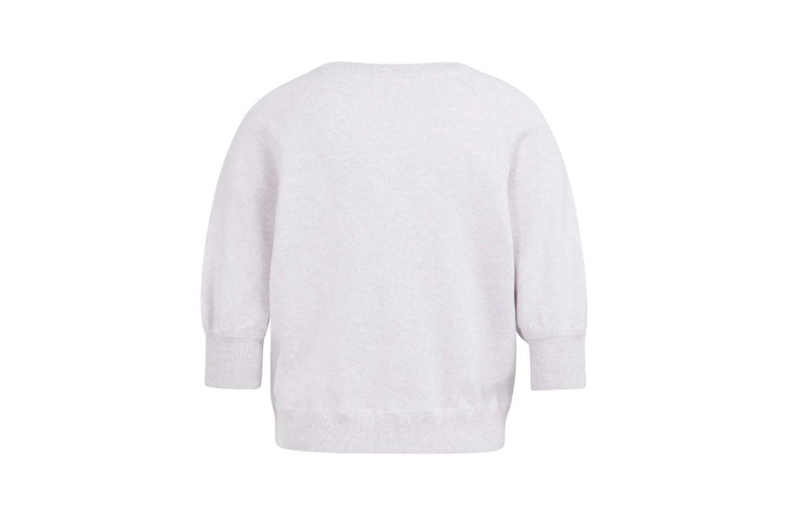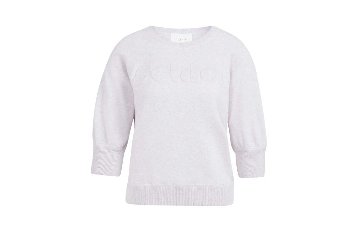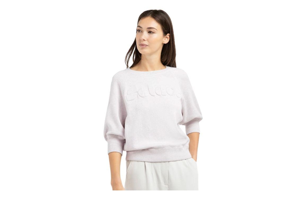 Yaya sweater 01-000563-603 338042. Dit soepelvallende model heeft een ronde halslijn en driekwart mouwen. Deze lichtpaarse sweater van Yaya is op de borst gedetailleerd met het ton-sur-ton geborduurde artwork en is afgewerkt met ribgebreide boorden.