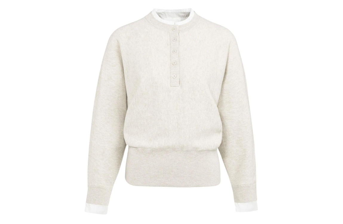 Yaya Sweater met kraagdetail 990402 HEeather grey mel. Dit rechtvallende model is voorzien van een ronde hals en lange mouwen. Deze beige sweater van Yaya is voorzien van een wit geweven inzetstuk met blousekraag en knoopsluiting. Dit model is afgewerkt met brede ribboorden aan de zoom en mouwen.