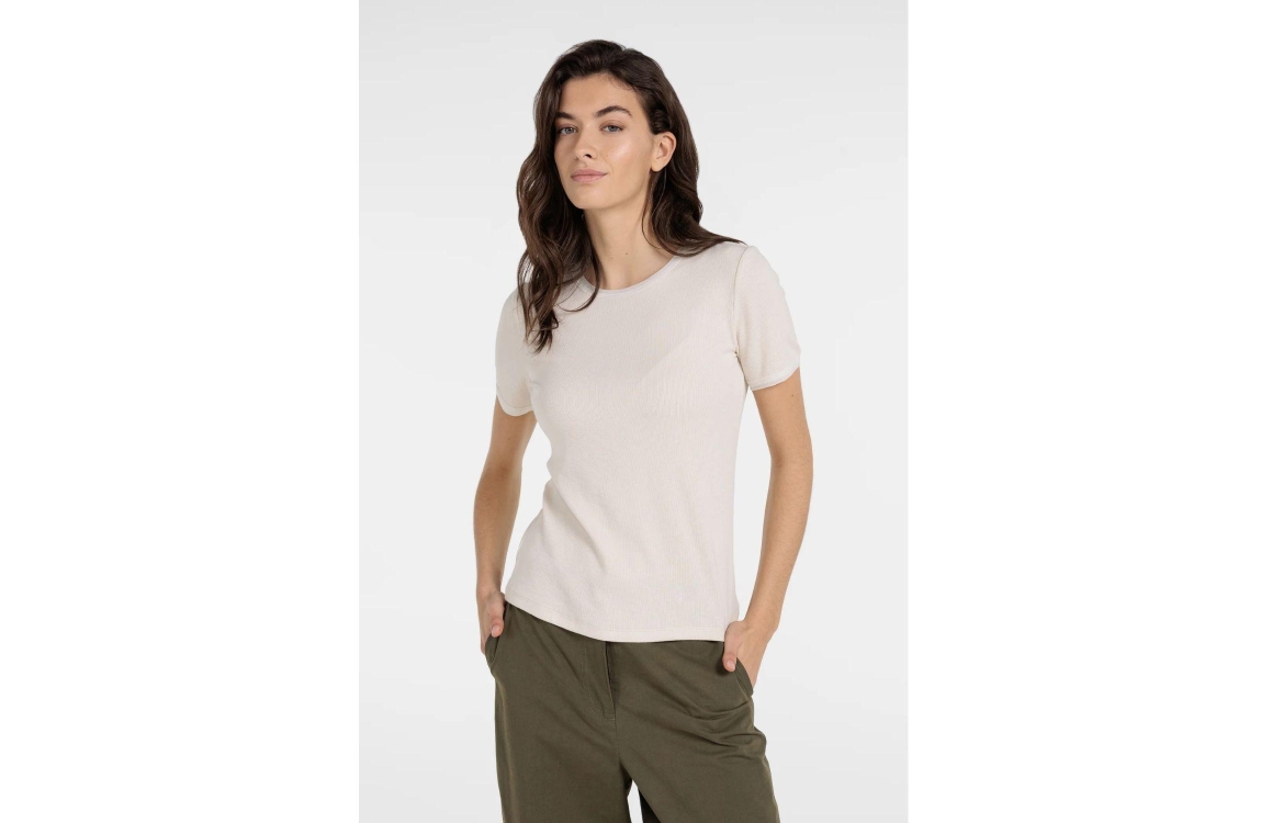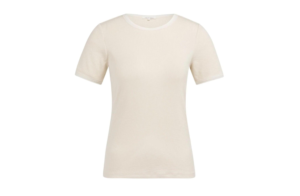 Yaya T-shirt with mesh edge 99058 Creme beige. Dit aangesloten model heeft een ronde halslijn en korte mouwen. Dit beige T-shirt van Yaya is gemaakt van comfortabele katoen en is makkelijk te combineren.