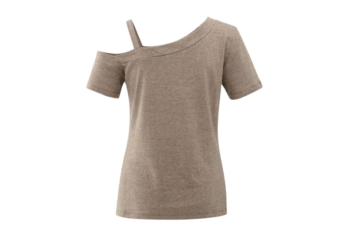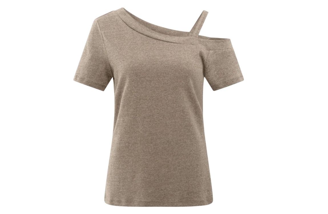 Yaya shirt met schouder trap 01-709304-507. Dit rechtvallend model heeft een asymmetrisch design met een afhangende schouder met band en korte mouw. Deze bruine shirt van Yaya is uitgevoerd in stretchkwaliteit en heeft een ronde halslijn.