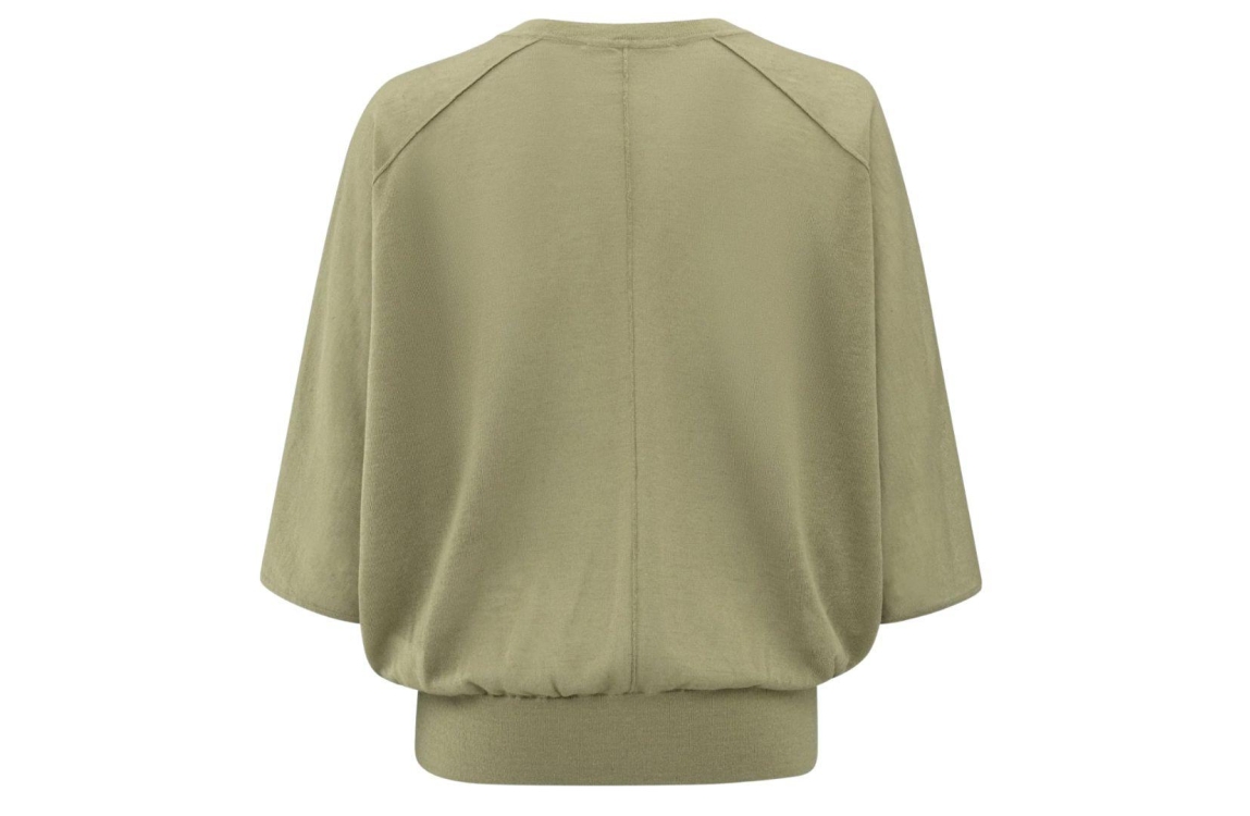 Yaya online sweater 01-000469-504. Dit soepelvallende model is voorzien van een ronde hals en driekwart vleermuismouwen. Deze groene sweater van Yaya heeft aan de onderzijde een elastische zoom. Dit model is uitgevoerd in een oversized pasvorm.