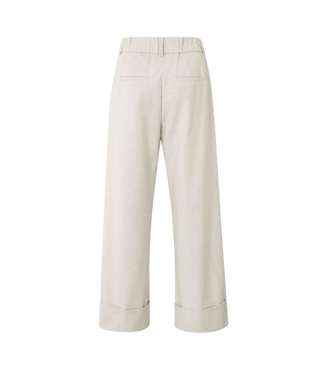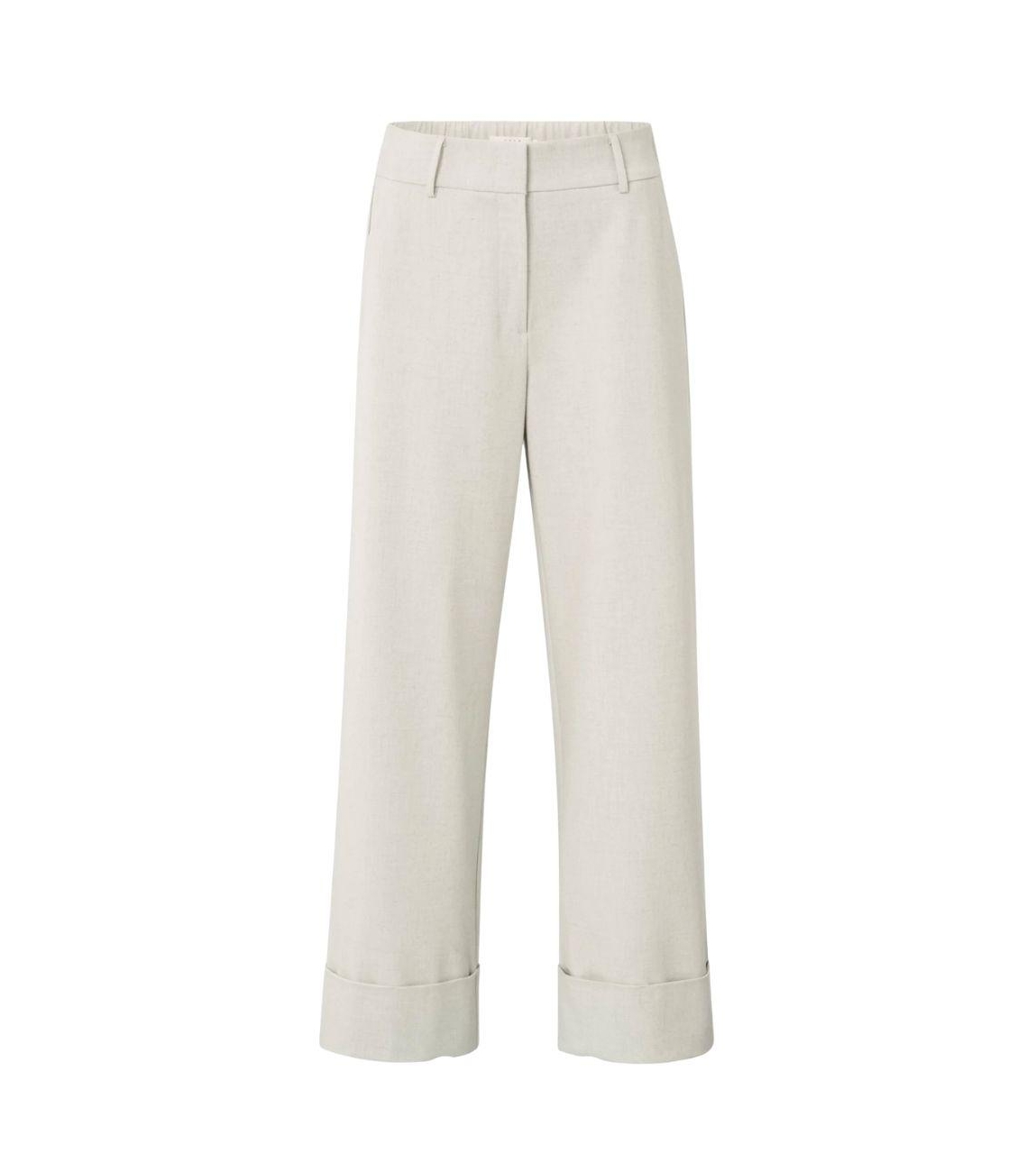 Yaya broek 01-301224-510. Dit wide leg model sluit door middel van een knoop- en ritssluiting en is voorzien van ceintuurlussen. Deze lichtgrijze broek van Yaya is voorzien van twee steekzakken aan de voorzijde en twee paspelzakken aan de achterzijde. Het model is afgewerkt met een brede, omgeslagen zoom.