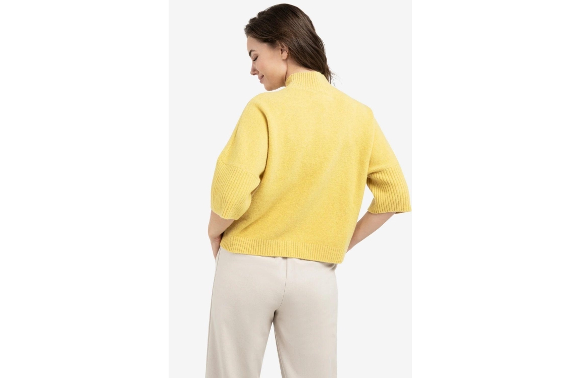 Yaya Trui met geribde driekwart mou 406262 Dried moss green mel. Dit wijdvallende model is voorzien van een geribde opstaande hals en heeft driekwart mouwen. Deze mos groene trui is afgewerkt met brede ribboorden. Dit model is voorzien van een grof ribpatroon. Het model is 178 cm en draagt maat S.