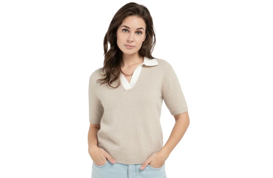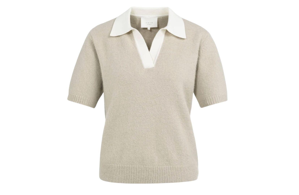 Yaya trui 01-000566-602 99043. Dit rechtvallende model heeft een witte polokraag met diepe V-hals en korte mouwen. Deze groene trui van Yaya is afgewerkt met ribgebreide boorden.