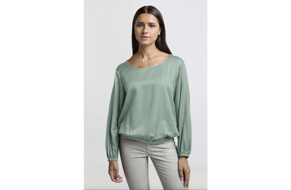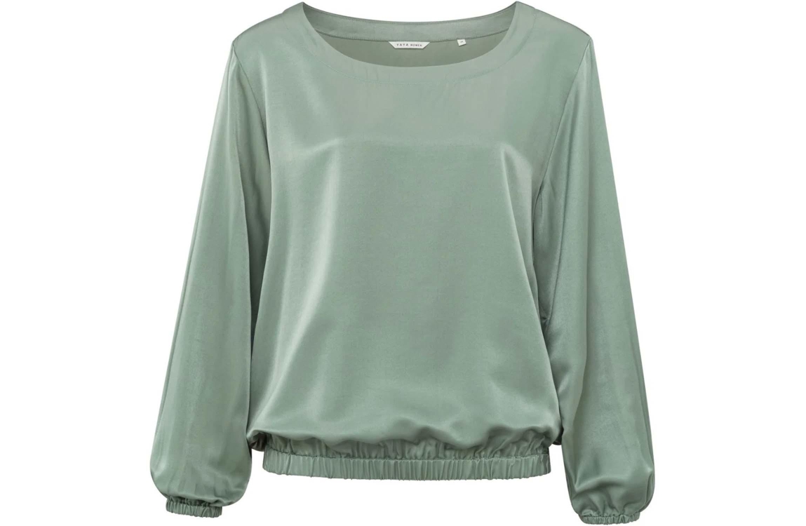Yaya blouson top 01-701221-409. Dit rechtvallend model is voorzien van een ronde hals en heeft lange mouwen. Deze groene satijnen look and feel top van Yaya is afgewerkt met elastische boorden.