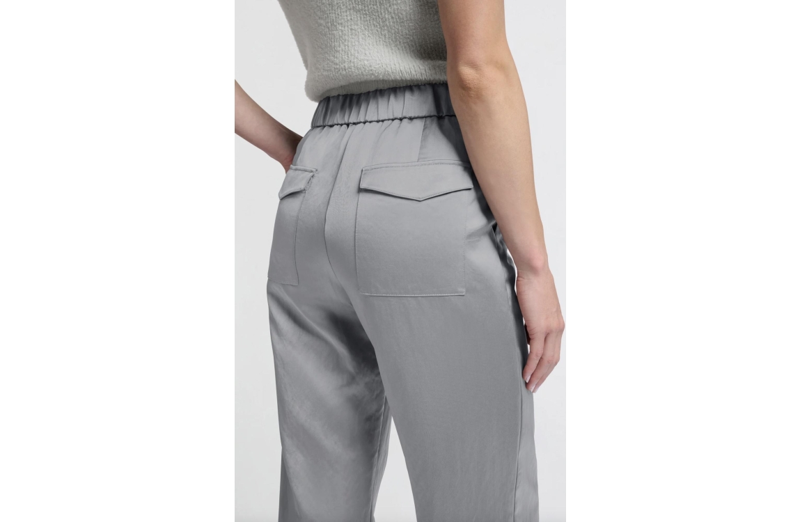 Yaya online broek 01-301162-410. Dit wide leg model beschikt over een elastische tailleband en sluit door middel van twee schuifknopen en een rits. Deze grijze broek van Yaya is uitgevoerd in een satijnen look en is voorzien van twee steekzakken aan de voorzijde en twee klepzakken aan de achterzijde.