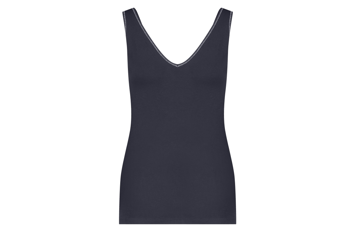 YOUR BEST LUXURY STYLE/8713782891033. Dit aangesloten model heeft een v-hals en is mouwloos. Deze navy blauwe tanktop van YOUR BEST LUXURY STYLE is afgewerkt met een lurex detail en is de perfecte basis tanktop.